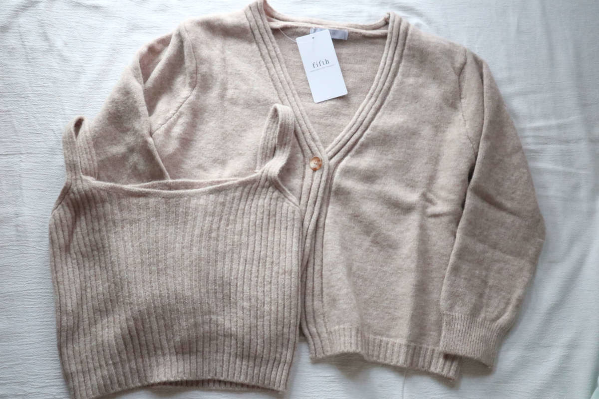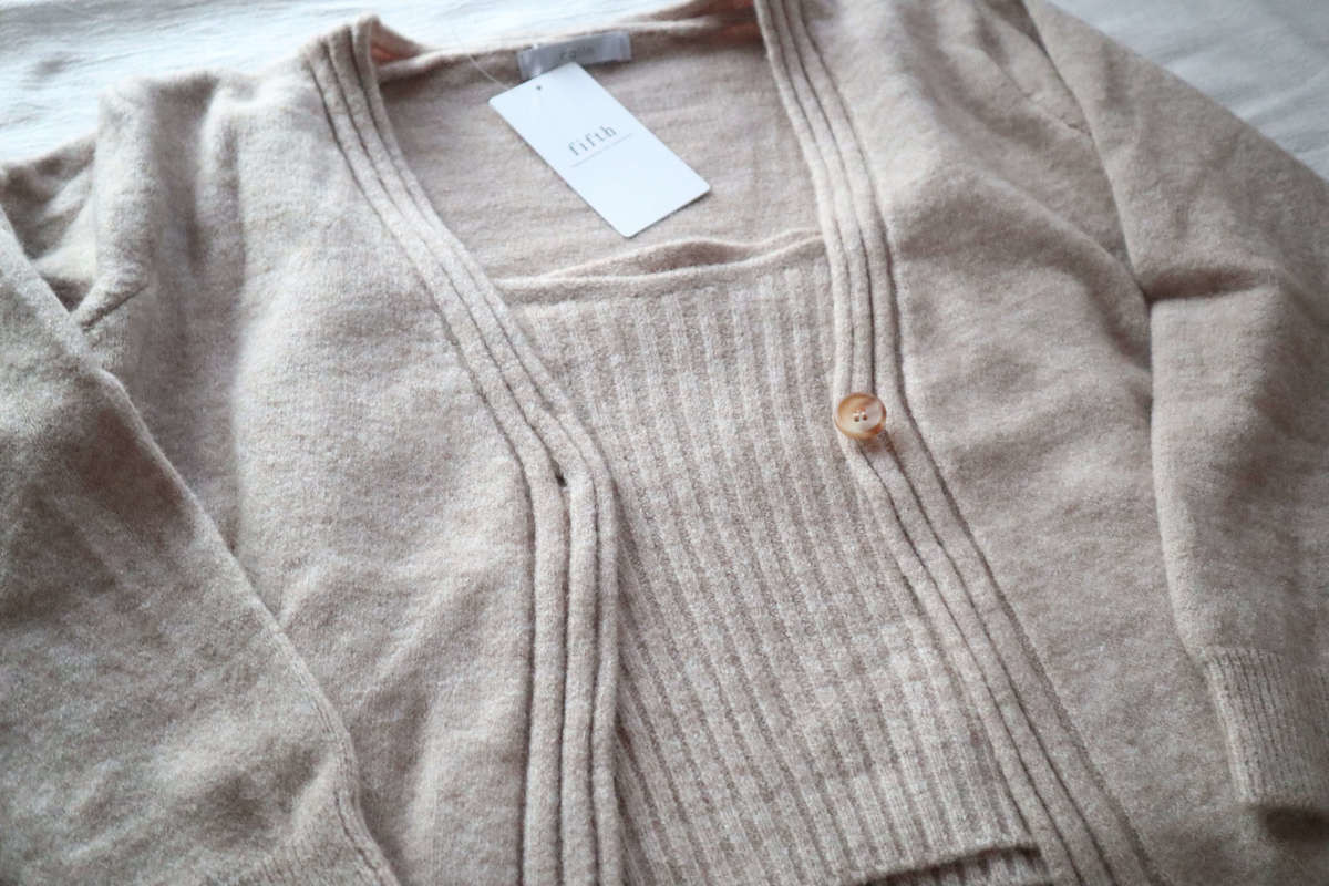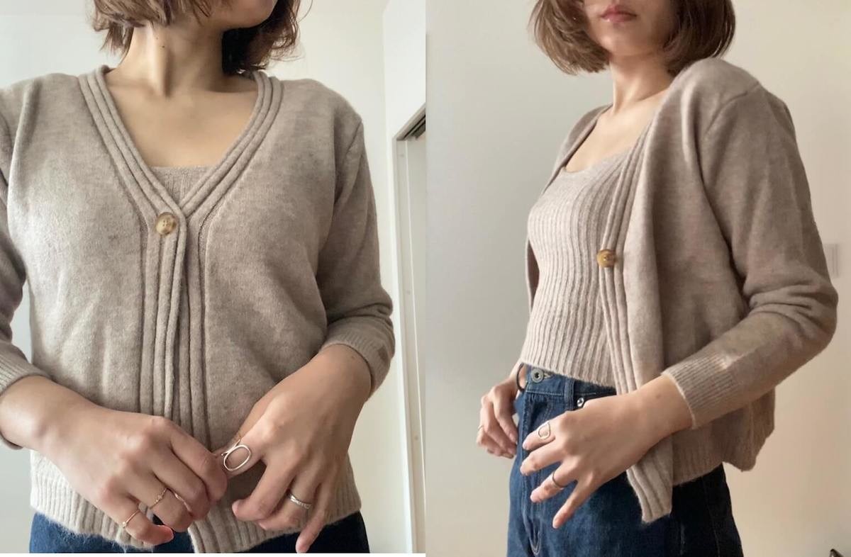 キャミとカーディガンのセットでこの価格は安い!品のあるベージュが肌をきれいに見せてくれる色なのでおすすめです。リブやボタンなど細部のデザインも凝っており、とても1000円台で買えるものには見えません。