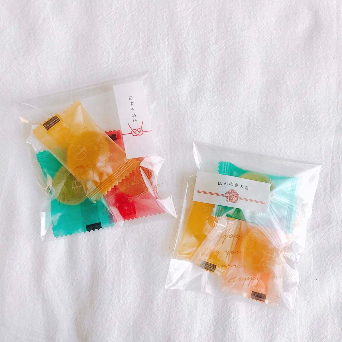 写真のようにお菓子に直接ペタっと貼れば、お菓子やおみやげを配るときにピッタリ!
