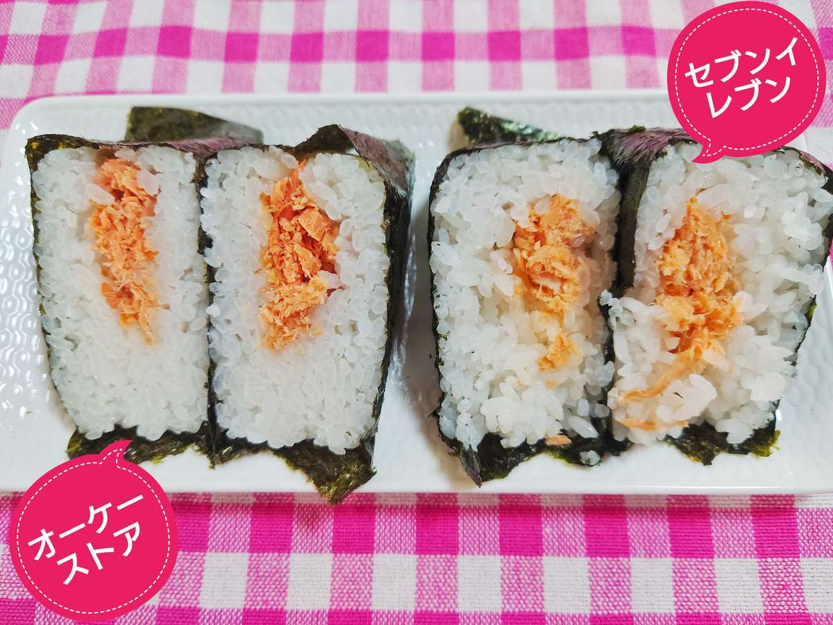 オーケーストアの方がごはんの圧縮が強めで、フレークっぽいしゃけです。それに対し、セブンイレブンはしゃけの身をしっかり感じられ、ごはんのつぶがふっくらしていました。