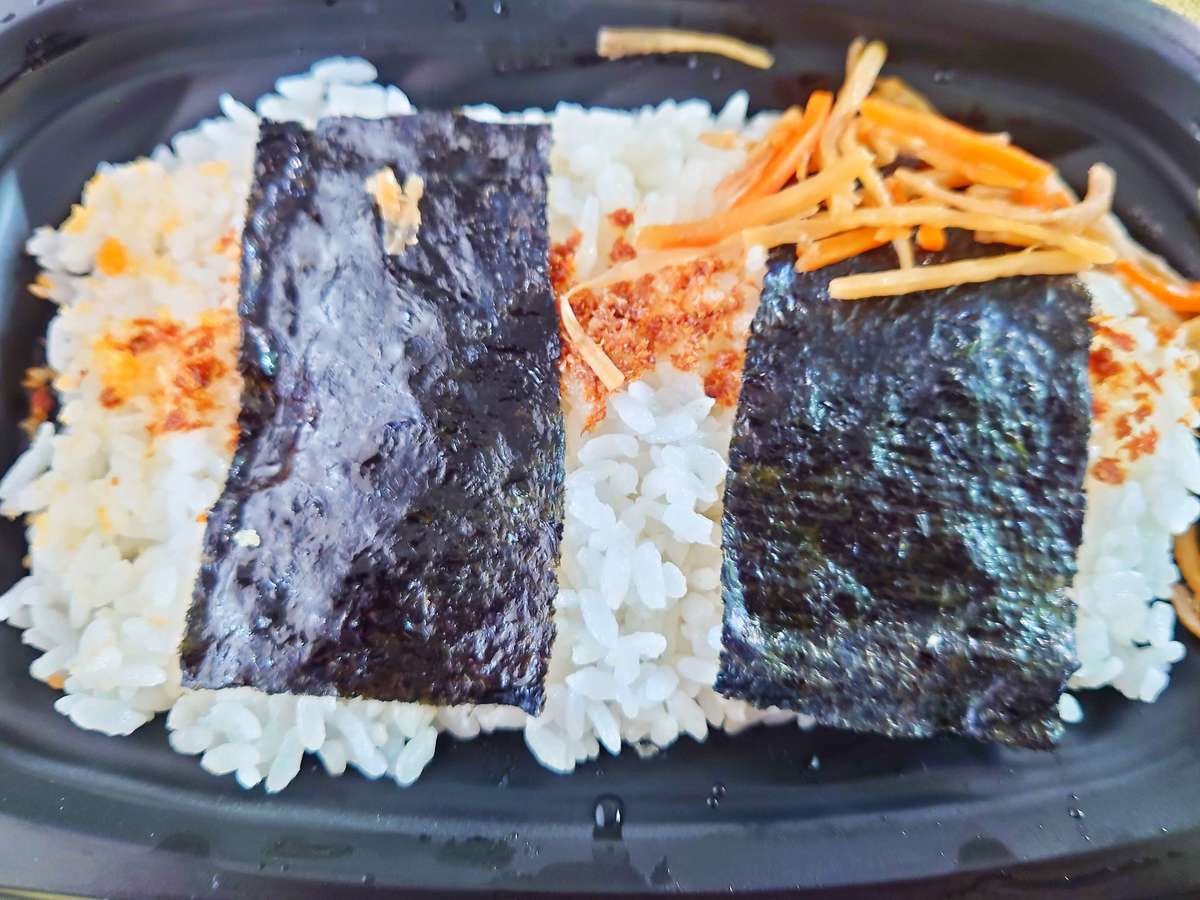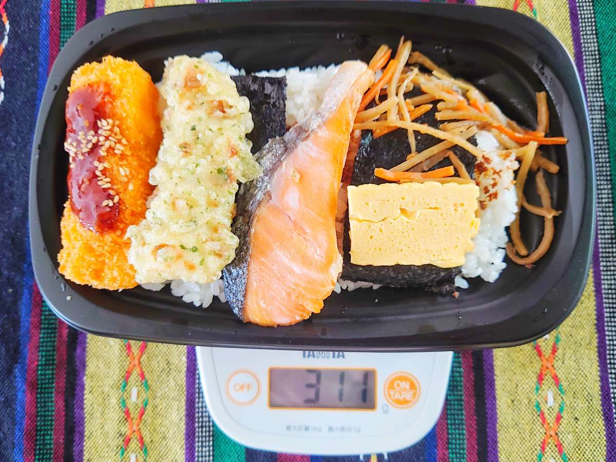 重さを計ると、383gとまずまずの量です。「のっけ鮭弁当」と同じ容器ですが、約70g多め。