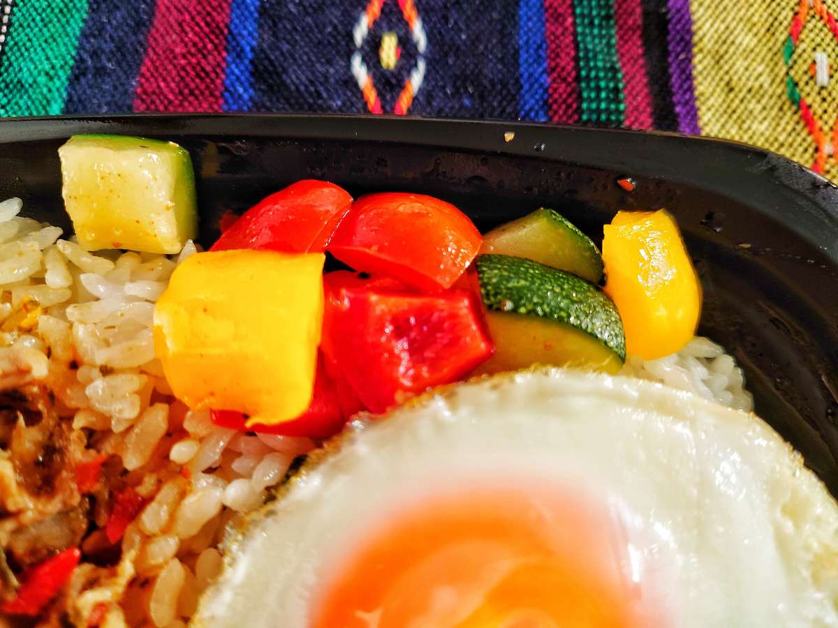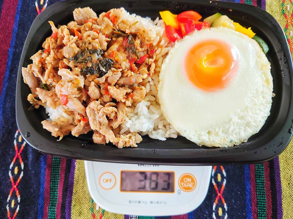 お弁当には、容器一面に引き詰められた日本米にバジル炒め、野菜、目玉焼きが乗っています。