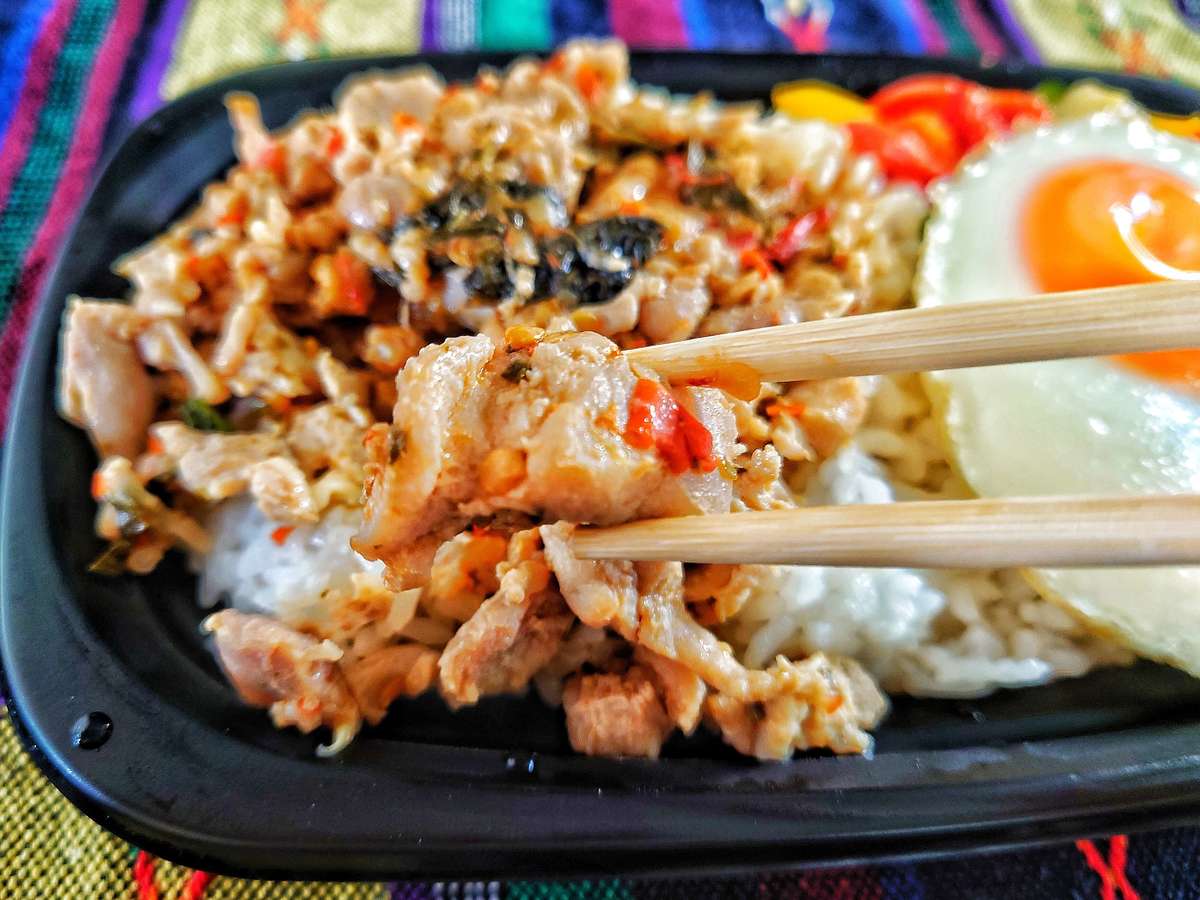 メディアにも取り上げられ話題になった、エスニックなお弁当。 「本格ガパオライス」は、唐辛子と本格的なソース、バジルの一種のホーリーバジルが使われ、本場の味が再現されています。
