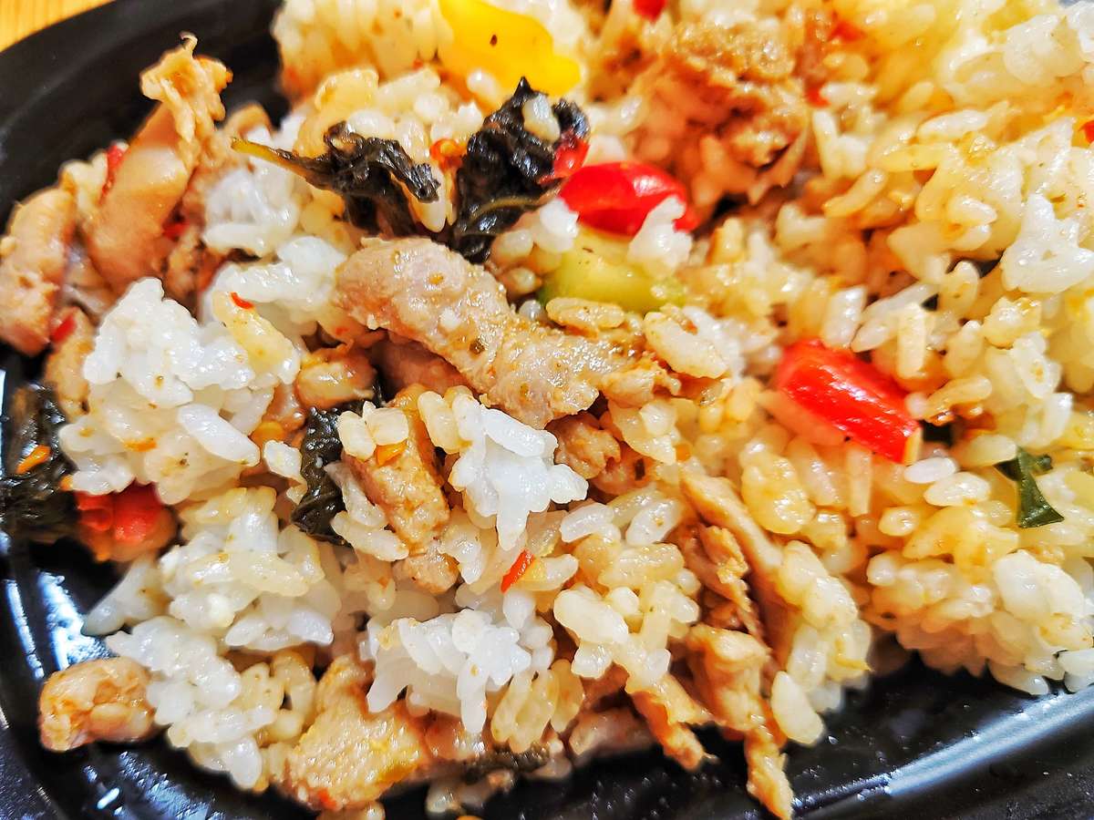 見た目は悪いですが、バジル炒めが染みている部分と真っ白ごはん部分を混ぜ、味を均一にしつつ食べるのがおすすめです。スパイシーな味と香りにハマりそうです♪