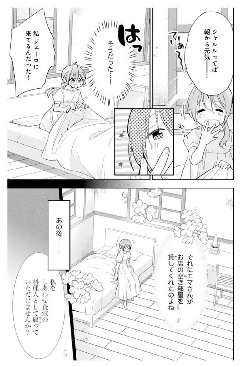 素性を隠しながらしばらく街で暮らすことにしたアリアは、ひょんなことから『しあわせ食堂』でシェフとして働くことに。アリアが作る日本食は人々の胃袋をがっしり掴み、食堂は瞬く間に行列のできる人気店へ。