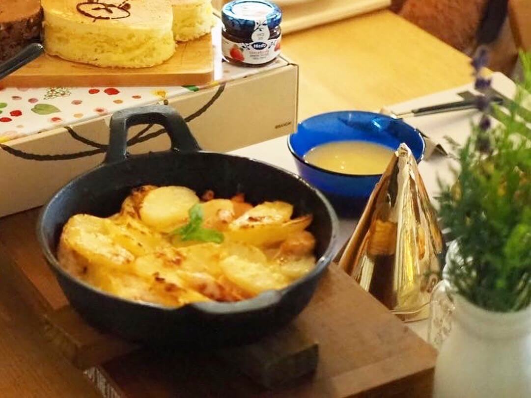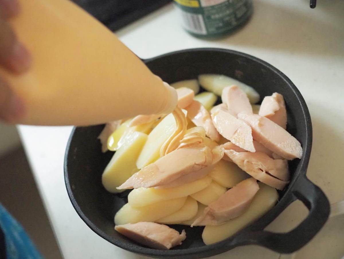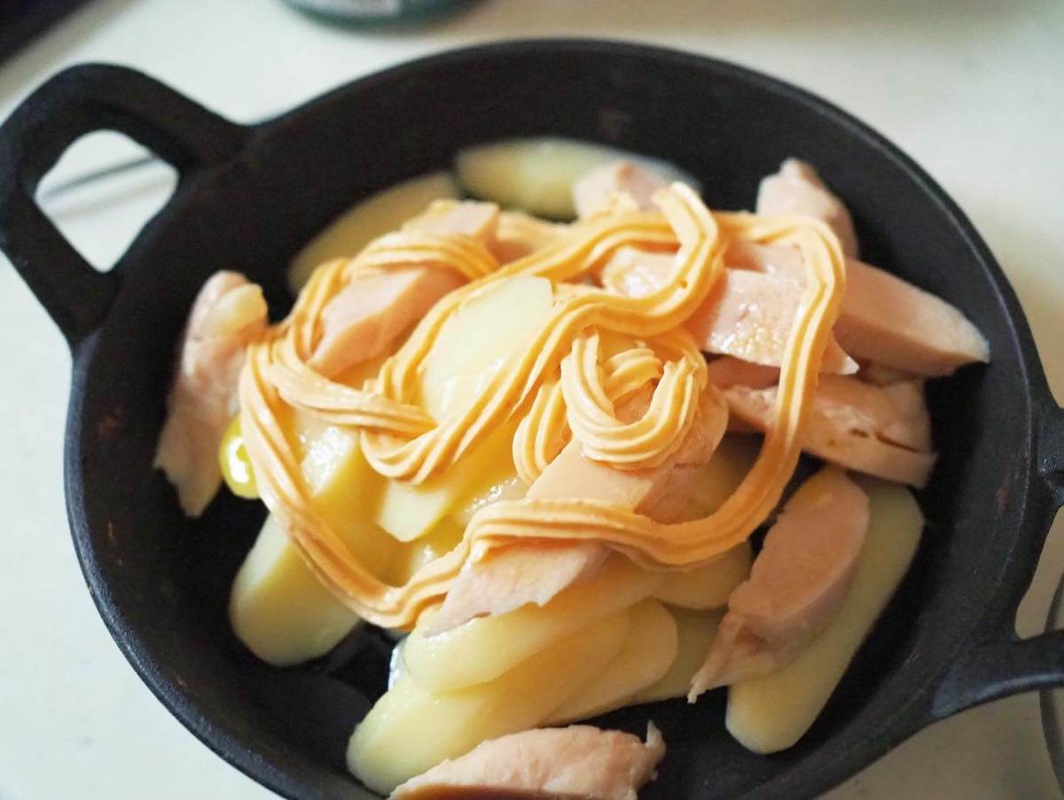 好きな大きさにカットしたじゃがいもに、めんたいマヨソースをかけていきます。お好みで鶏肉などをいれても◎。