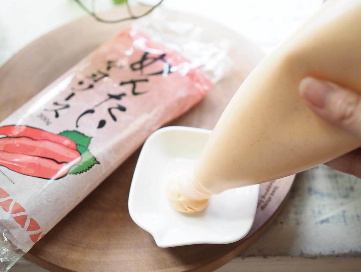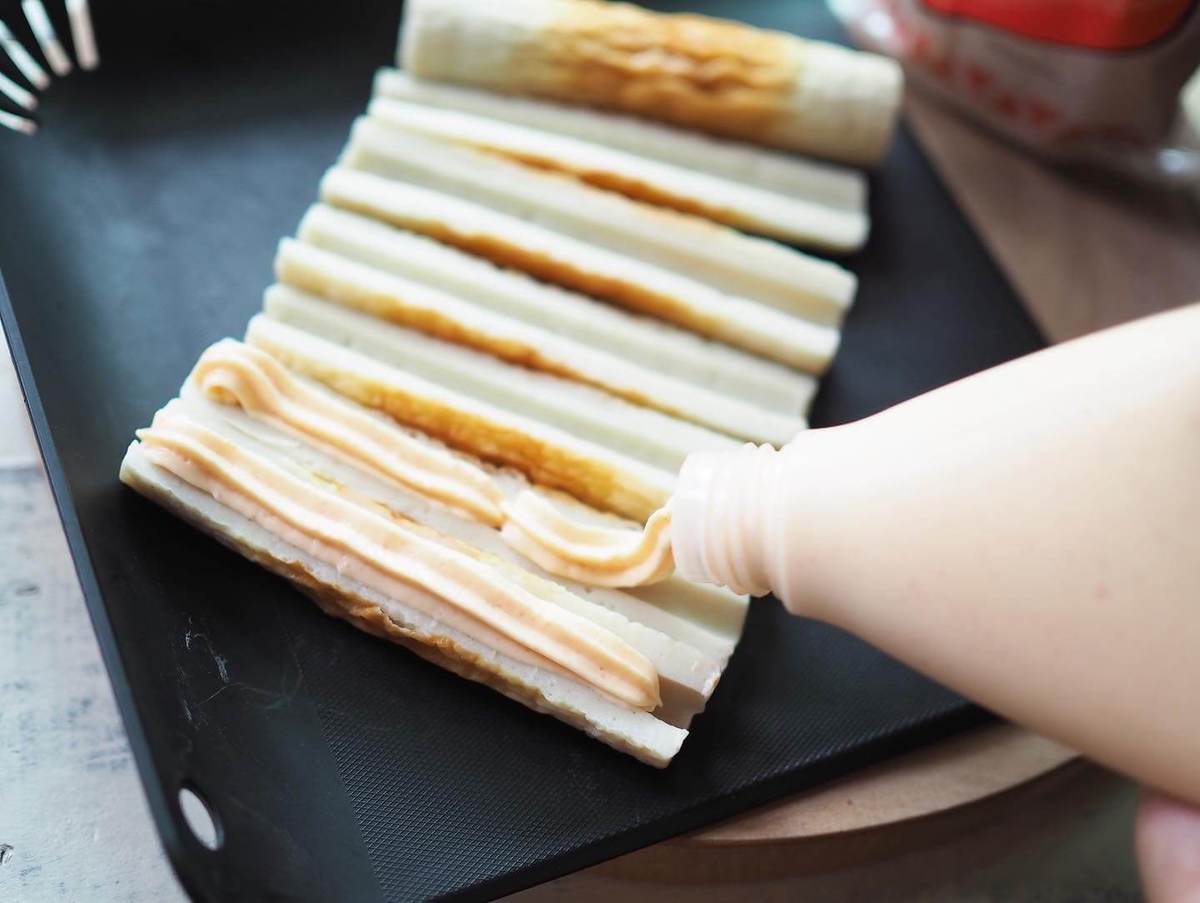 続いてちくわの穴側にめんたいマヨソースをつけていきます。