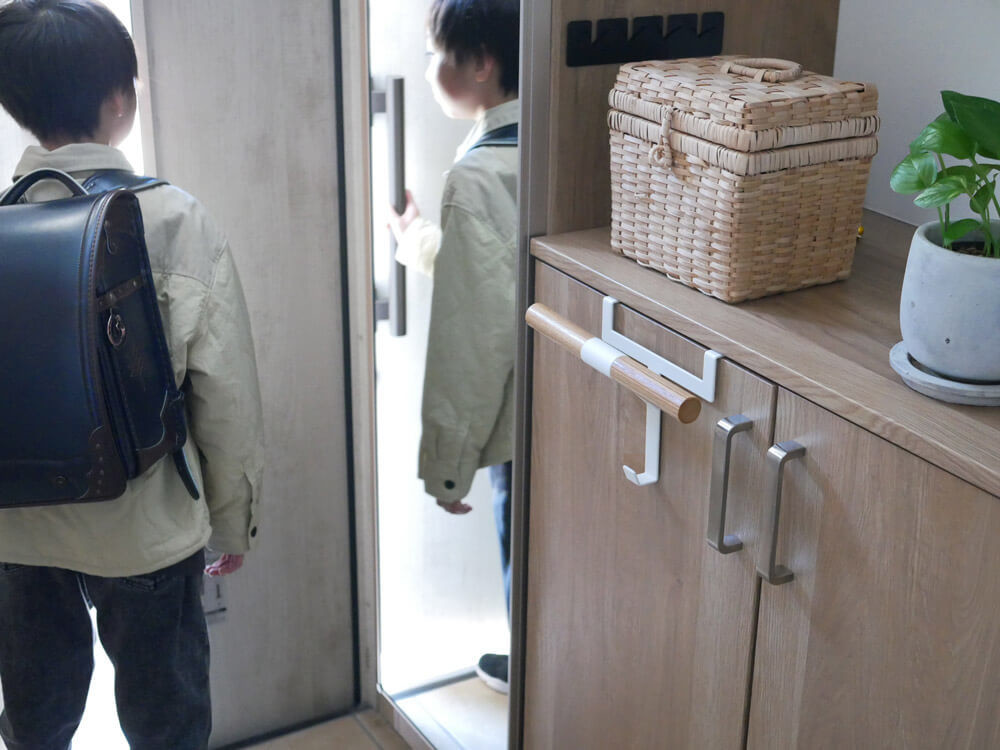 忙しい朝でも玄関で全てが揃っていたら、必要以上に焦る必要もなくなるかもしれません。 しかもランドセルや通園カバン、通園通学帽子、手提げや上履き、給食の白衣など、玄関にポイッと置いておくより、断然整理整頓感がUP。