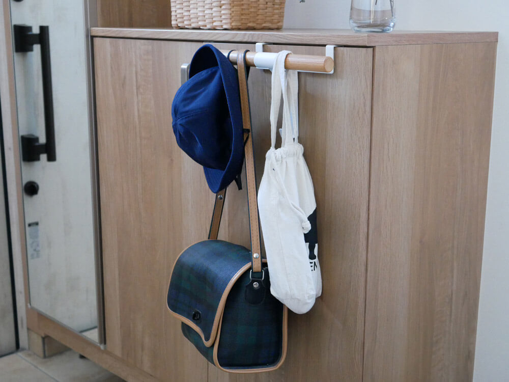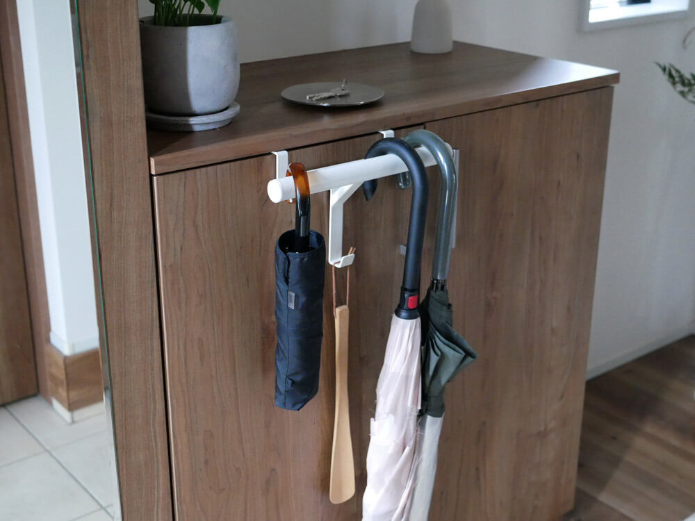 カバンの他にも傘や折り畳み傘、靴べら、エコバッグ、マフラーの一時置きにも最適。