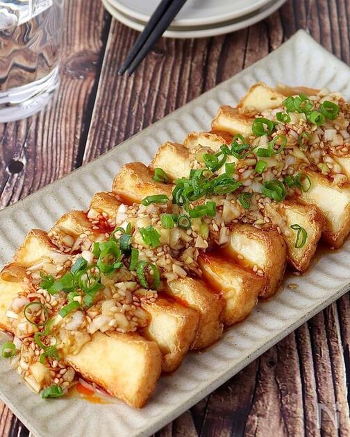 中華料理の定番・よだれ鶏を厚揚げでアレンジしたこちらの一品。こんがり焼いた厚揚げに、ピリッと辛いタレがアクセント。おかずとしてはもちろん、ビールのおつまみにもおすすめです。