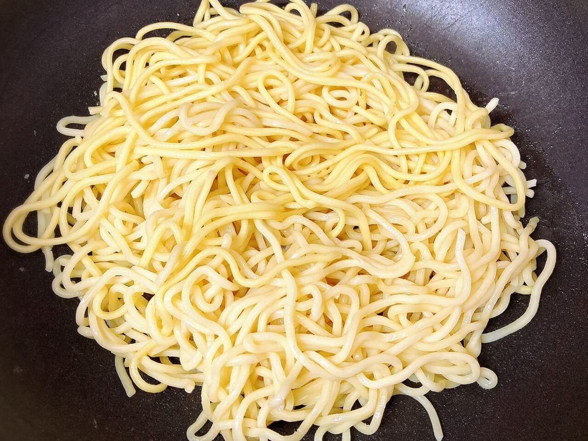 野菜を炒めたのとは別のフライパンを用意し、麺を焼きます。