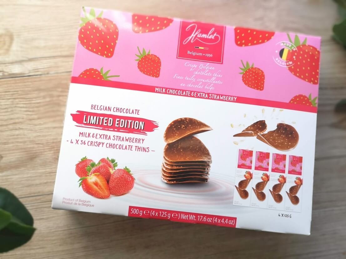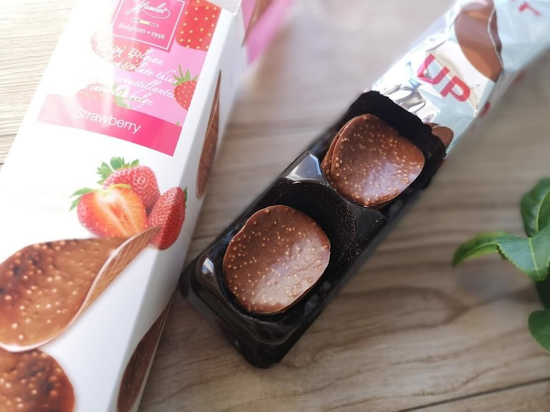 爽やかで甘酸っぱいイチゴ味がどうにもこうにも止まらないおいしさの「ハムレットクリスピー ストロベリー」! 薄いチップス状のチョコレートが、パリ!カリカリとろ~りな食感で最高です。