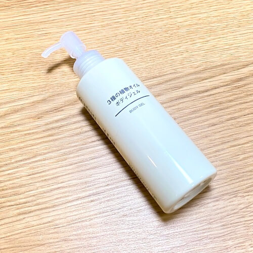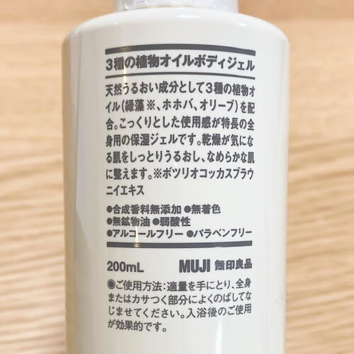 無印良品のビューティーコーナーでみけた 「3種の植物オイル ボディジェル 200ml ¥1,490(税込)」。
