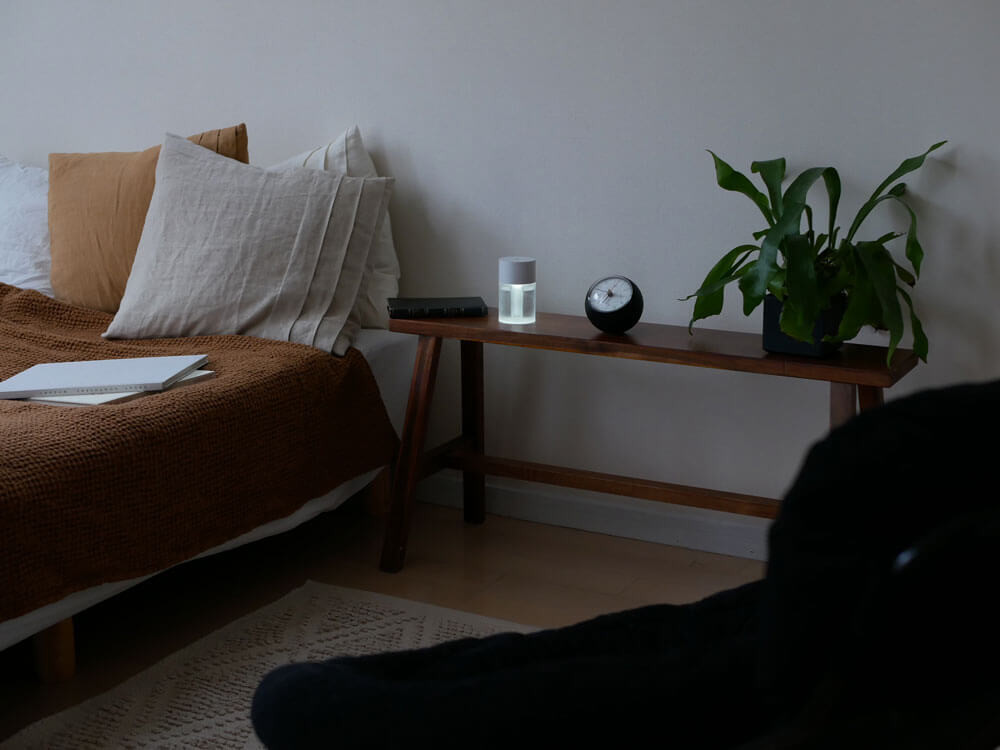 動作音も静かな超音波加湿器は、寝室にも。 ほのかなLEDライトが暗い部屋を優しく照らしてくれるから、お休み前のひとときにぴったりです。