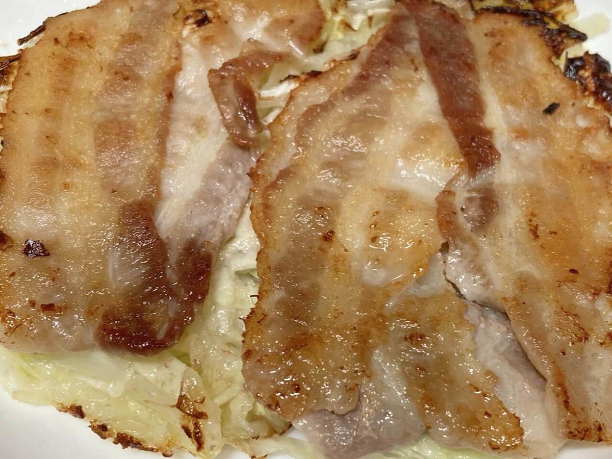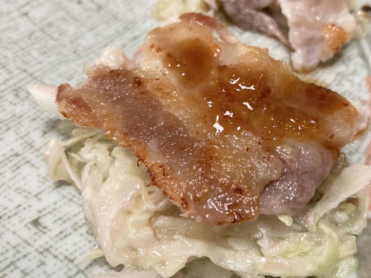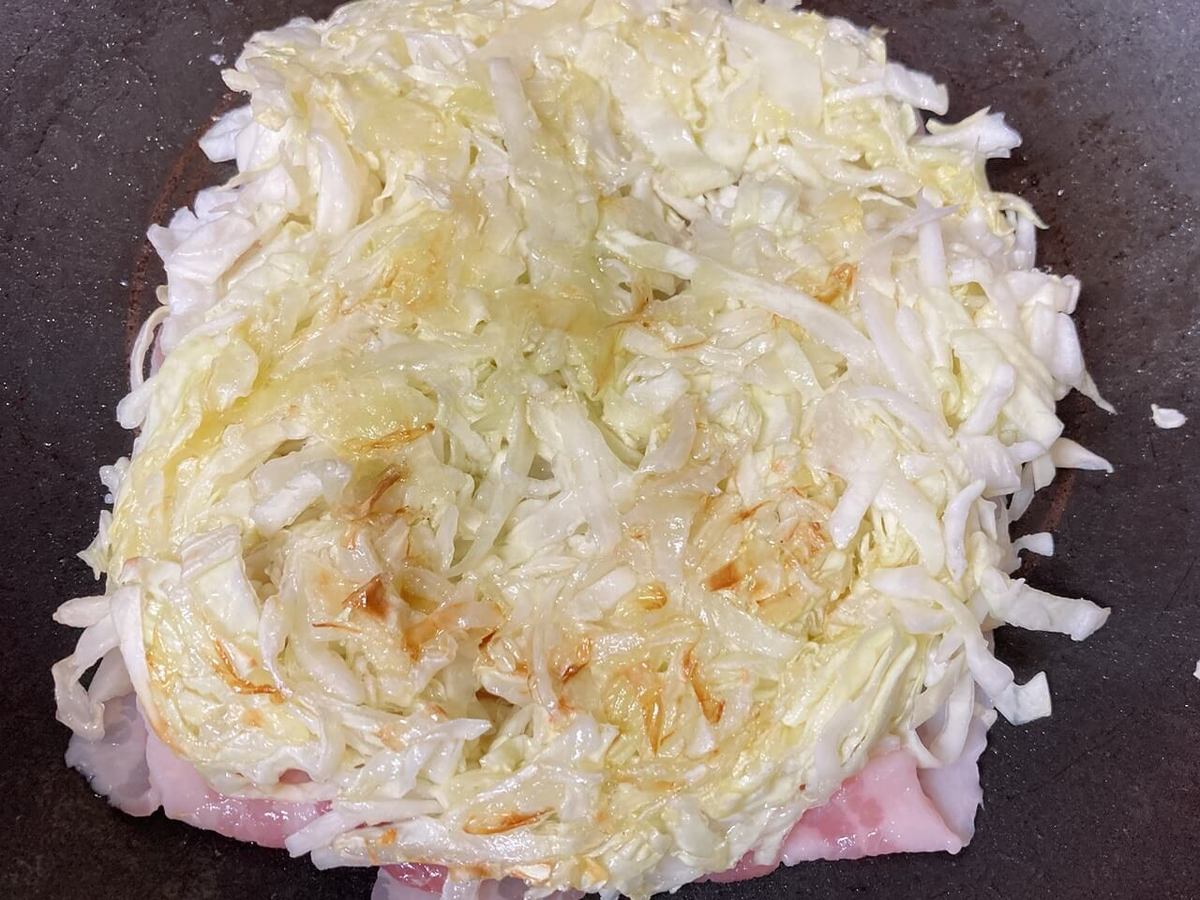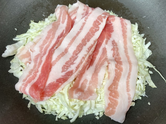⑤豚バラ(50g)を重ならないようにキャベツにのせ、フライ返しでひっくり返し、表面を押さえフタをして2分蒸し焼きにする