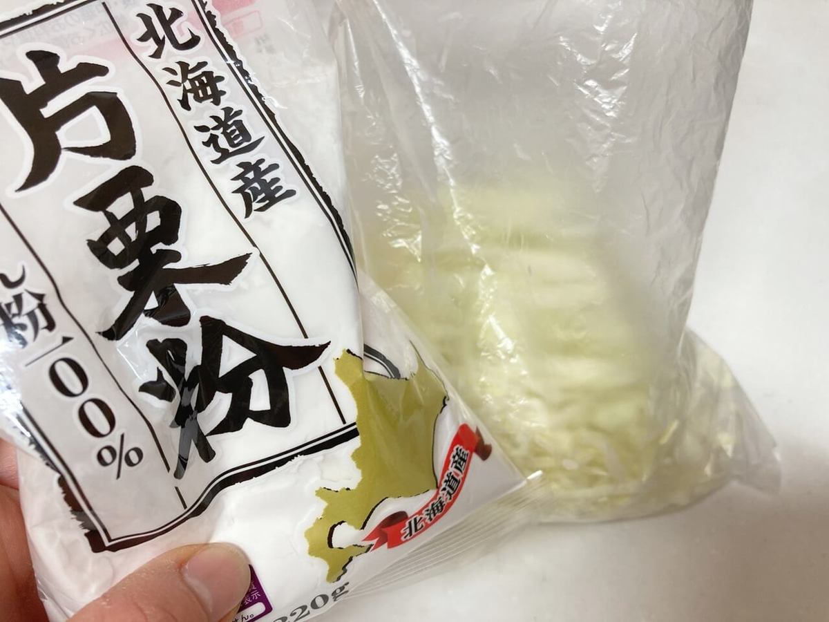 ②千切りキャベツをポリ袋に入れ、片栗粉(大さじ1)と塩(ひとつまみ)を入れ、袋の口を閉じる