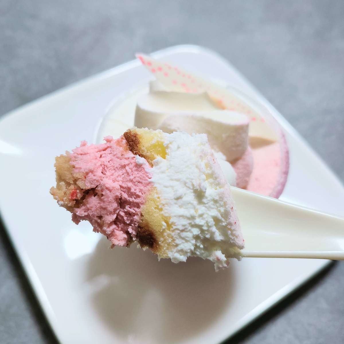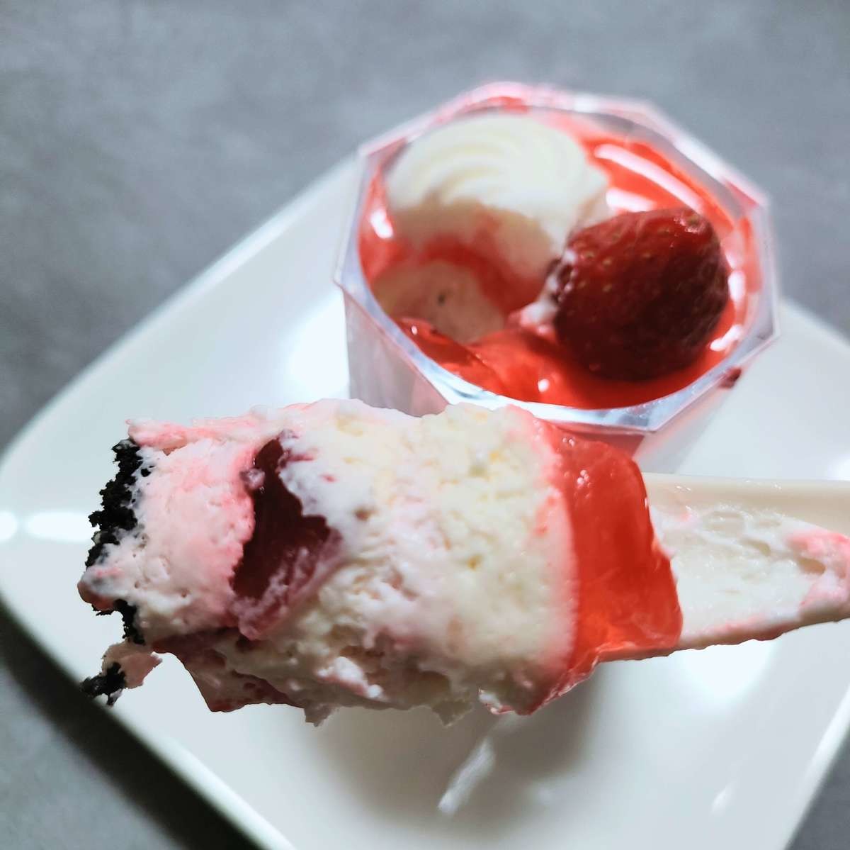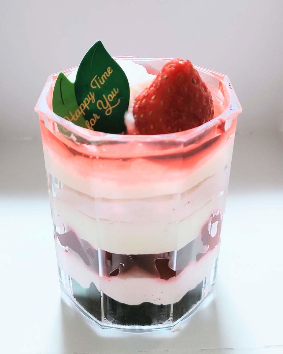 ほろ苦いココアビスケットと、甘いクリームと、甘酸っぱい苺の相性が抜群すぎる!また、苺ゼリーの食感がよく、いいアクセントになっています。