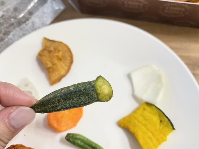 野菜チップスではあまり見かけないオクラも入っています♪低温フライしているので、オクラのネバネバは期待していませんでした。