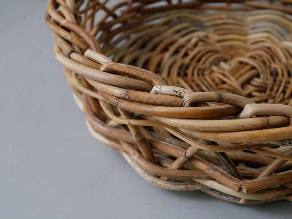 ラタンよりも希少価値が高く、皮がついているので頑丈、黒い斑点や色味、藁の太さに違いがあり、どこかアンティークな風合いが味わい深い素材です。