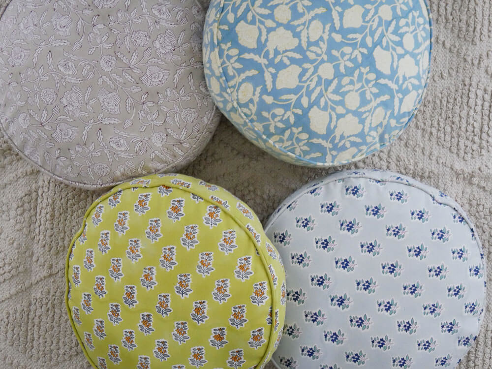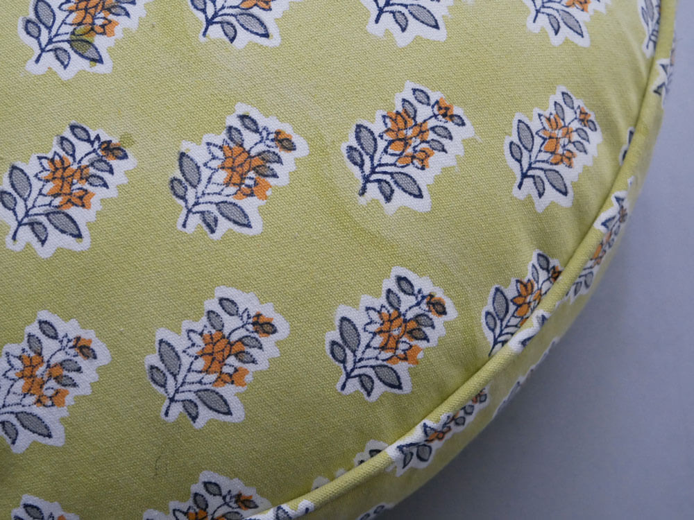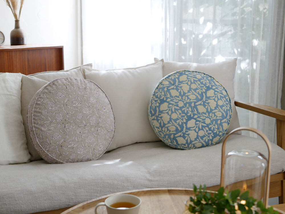 インドで手作業で裁断、縫製しているこちらのファブリック。 北欧柄にもアジアンテイストにも見える、万能な柄はリビングや和室、寝室、子供部屋とどこに置いても馴染み、インテリアの柔らかなポイントとして成り立ってくれそう♪