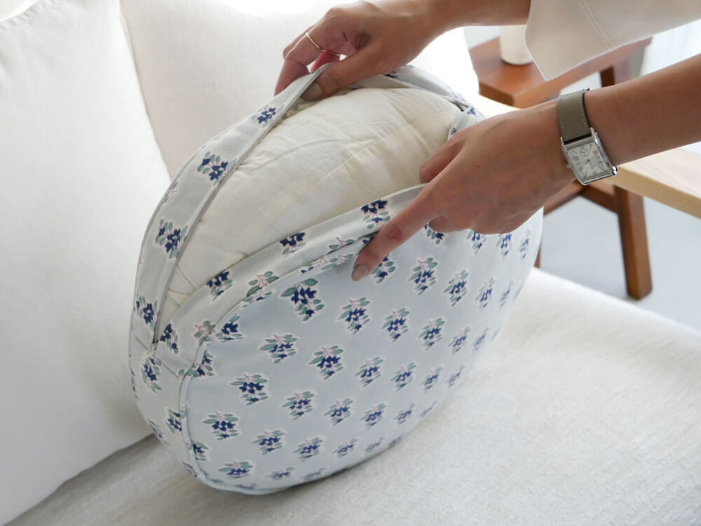 「クッション」はバスケットに入れなくたって、こんなにも可愛い! 角のないラウンド型がくつろぐリビングにぴったり。