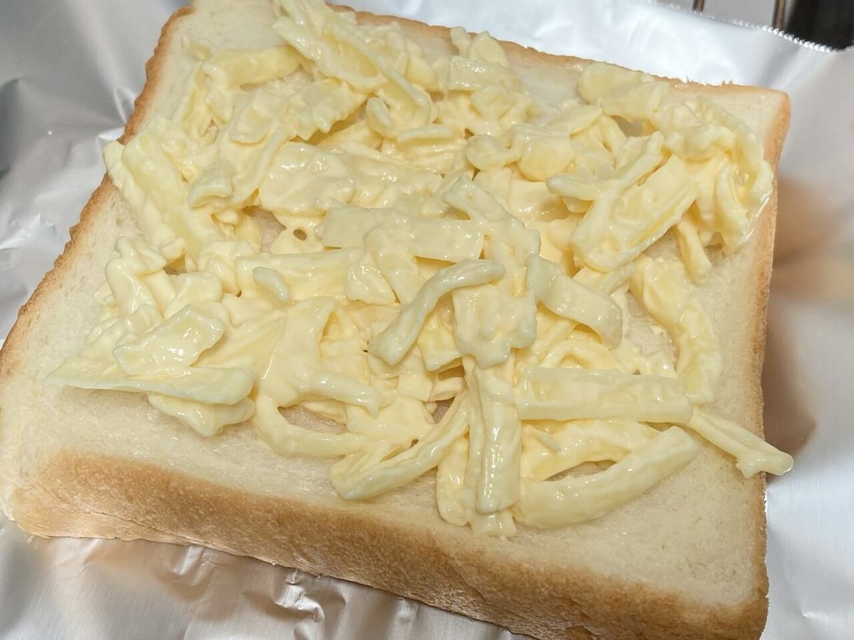 食パンにマヨネーズ塗ってチーズのせて焼いてもこれほど伸びないので、初めにしっかり混ぜ合わせるのが伸びやすくなるコツなのかな。