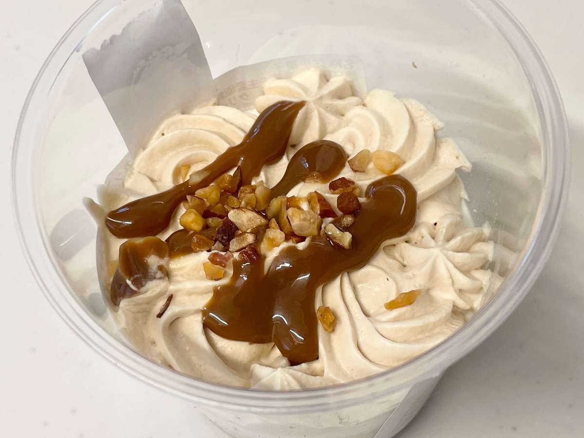 キャラメルホイップにキャラメルソースがかかっていて、ビターな味わいが濃厚です。