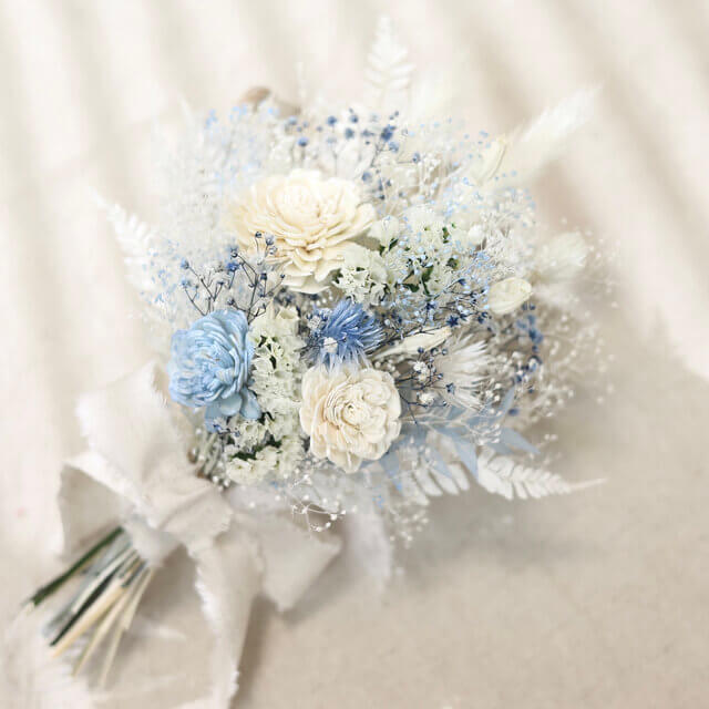 ホワイトの中に、淡いブルーがアクセントになった、透明感がハンパない「ブルーのドライフラワーのブーケ」です。部屋に飾ってもポイントになりますが、ブライダルで使用する方にもおすすめです。