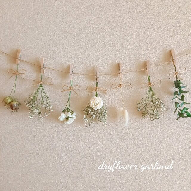 フラワーのガーランドで迷ったらコレ!ってくらい、シンプルでおしゃれな作品「ドライフラワーのガーランド」です。ホワイト×グリーンが、自然とお部屋に溶け込むのでドライフラワー初心者の方にもおすすめの作品です。