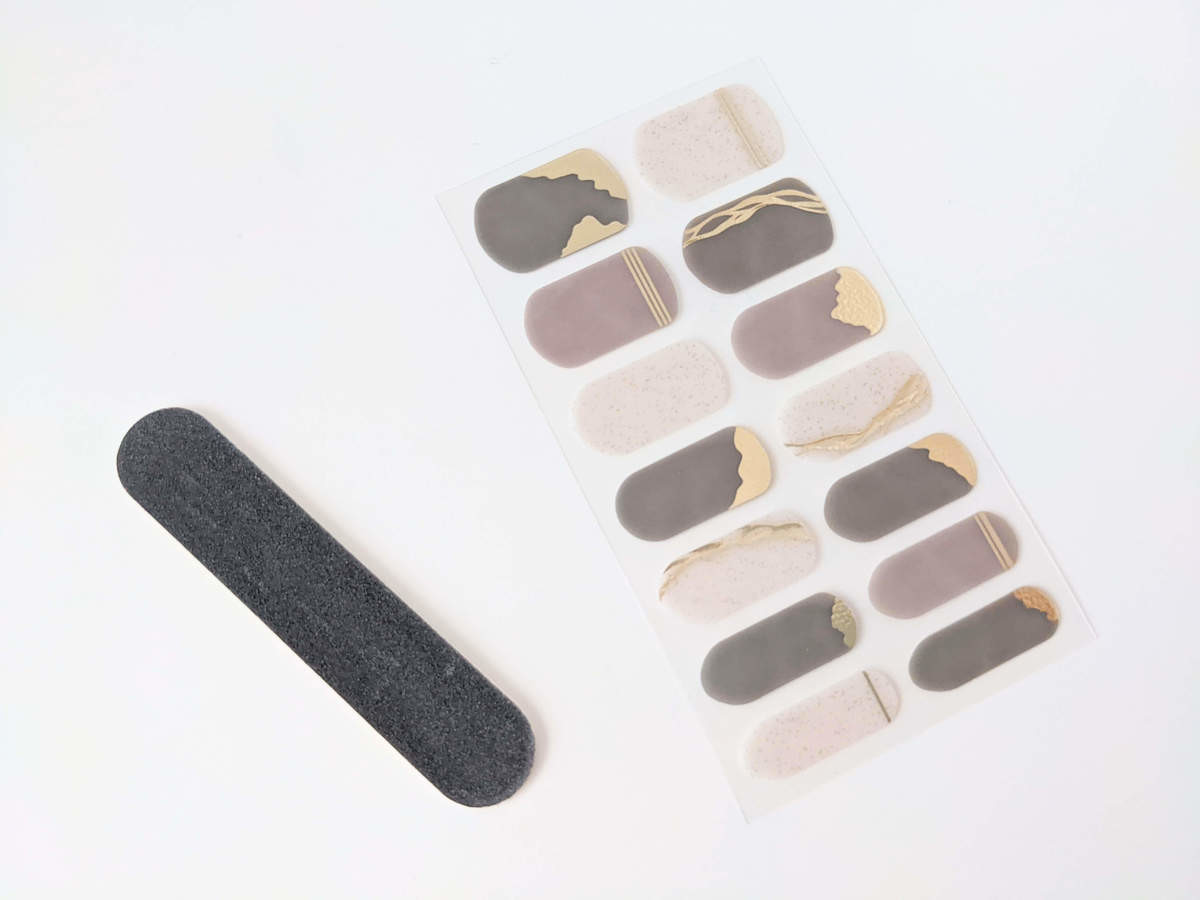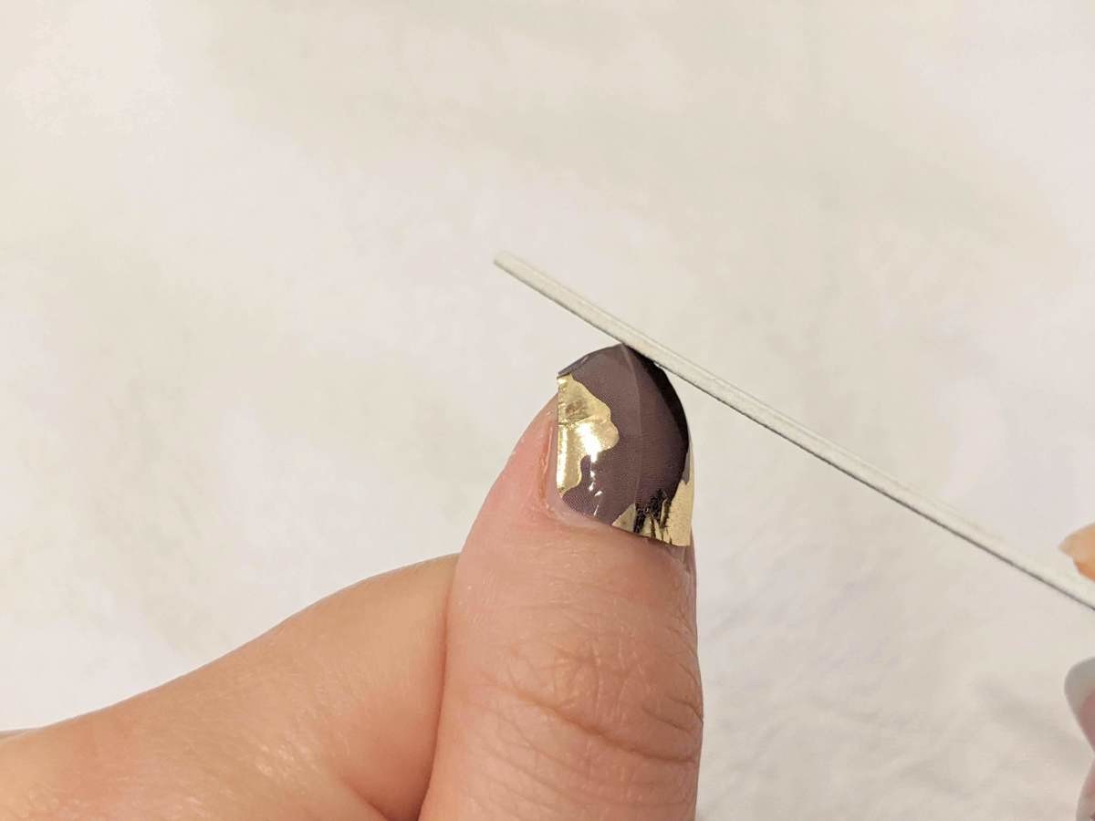 爪に対して爪やすりを45~60度に傾け、上から下へ一定方向にゆっくりと削ります。 余分なシールが削れていくので、ハサミなどでカットする必要はありません。
