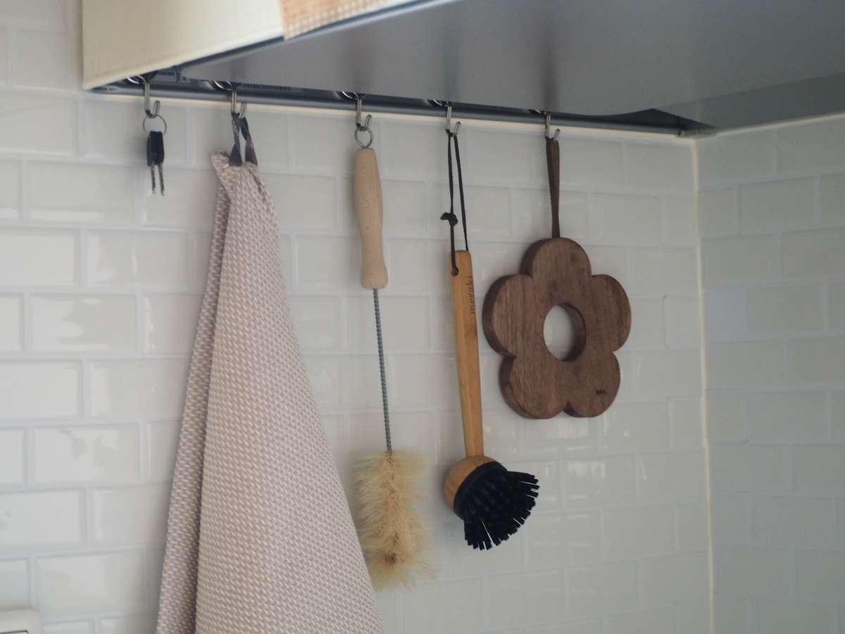 キッチン周りのあれこれを浮かせるのに大活躍しているマグネットフック。