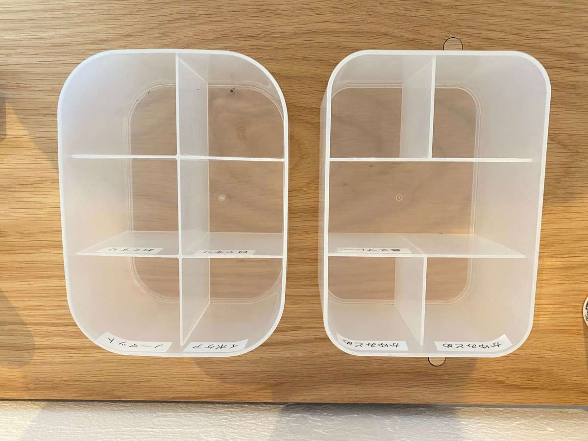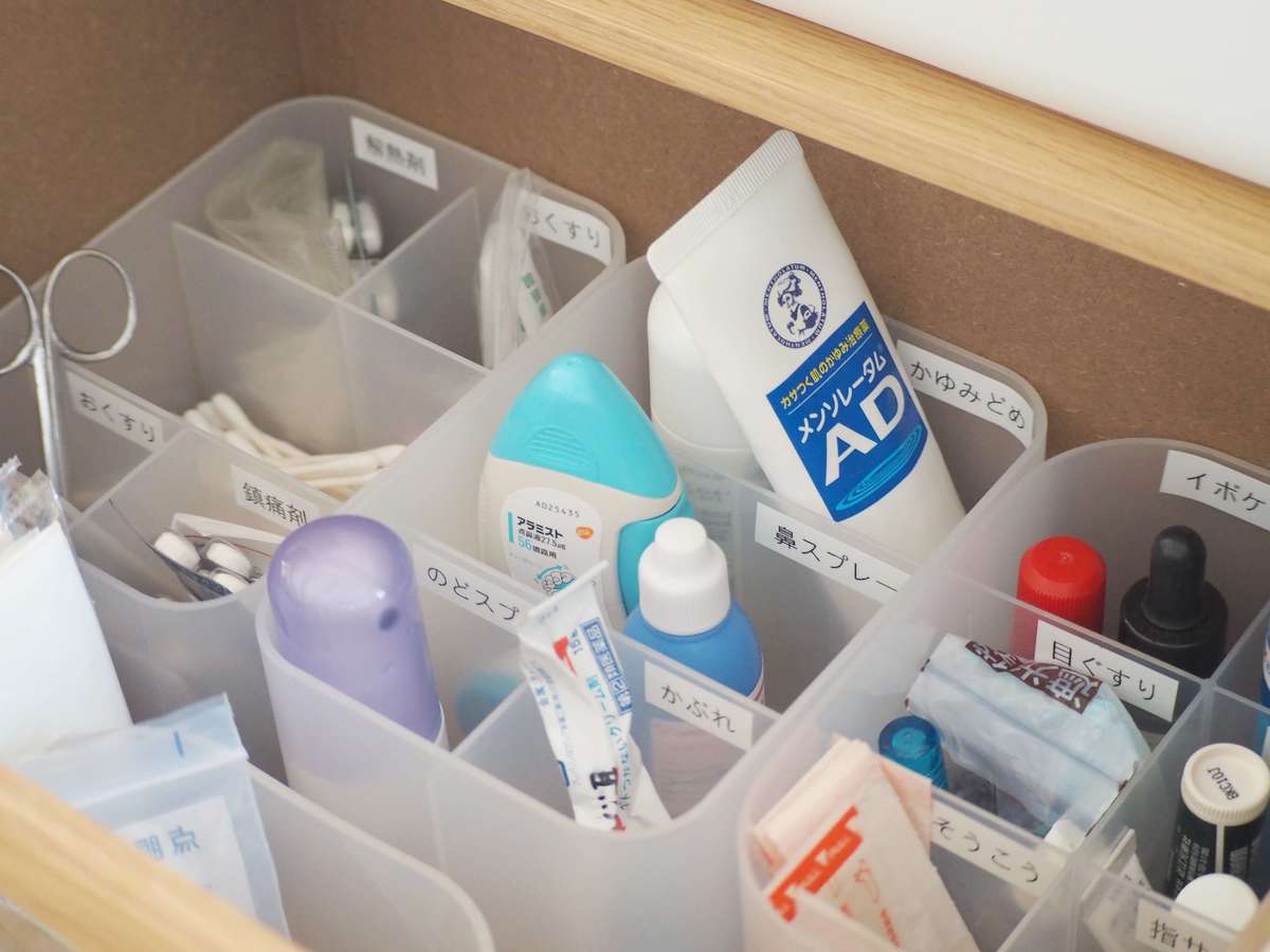 細かなものをまとめるのに便利な、仕切り付きの積み重ねボックス。我が家では主にお薬の収納に活躍しています。