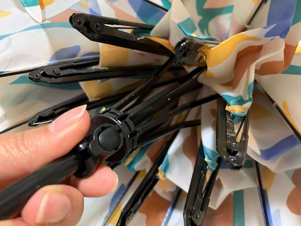 まず、傘を開く部分はボタンの様になっています。内側の骨部分も全て黒で統一されており、全体的に高見えする折り畳み傘です!