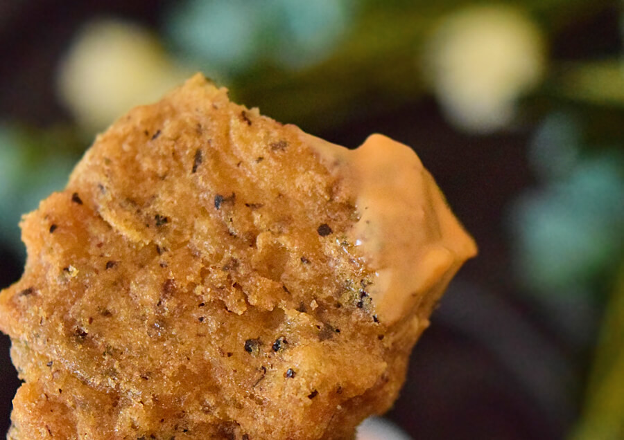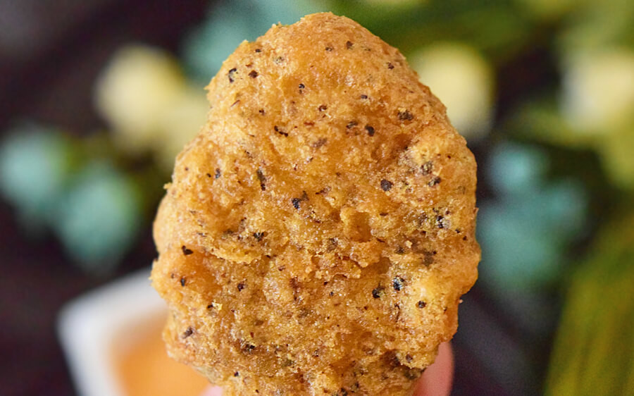 粗挽きブラックペッパーとガーリックで味つけされている、「スパイシーチキンマックナゲット 黒胡椒ガーリック」200円(税込)。期間限定品です。