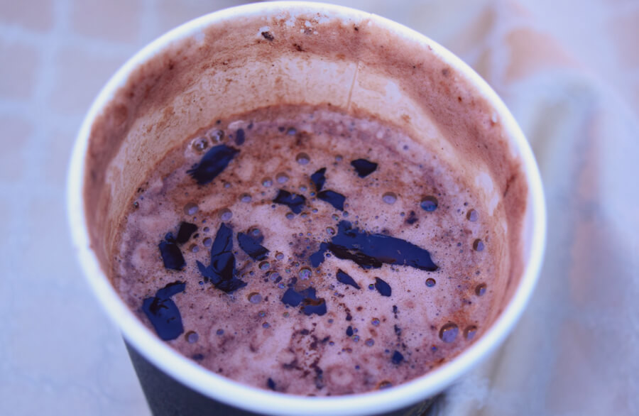 すでに、ベルギー産シェイブチョコレートが溶けかかっていますね。悠長に自宅まで持ち帰っていったら、シェイブチョコが溶けてホットチョコレートと一体化していたかもしれません。