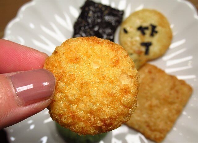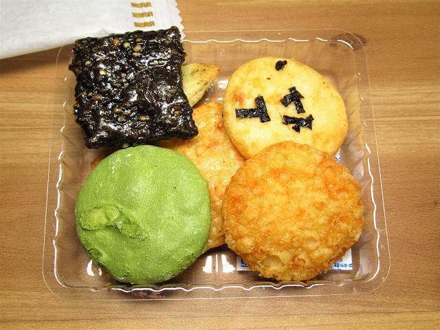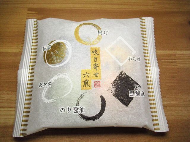 こちらは米菓子で「揚げ、おこげ、黒胡麻、抹茶、あおさ、のり醤油」の6種類の小さなお煎餅が1袋に入っています。