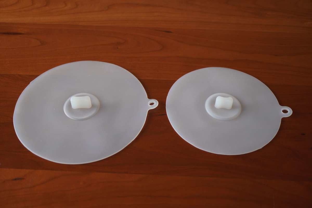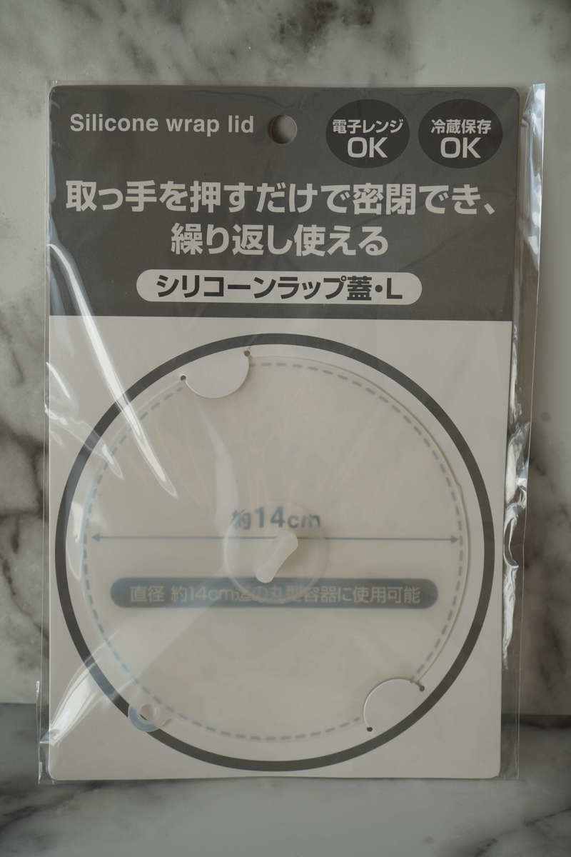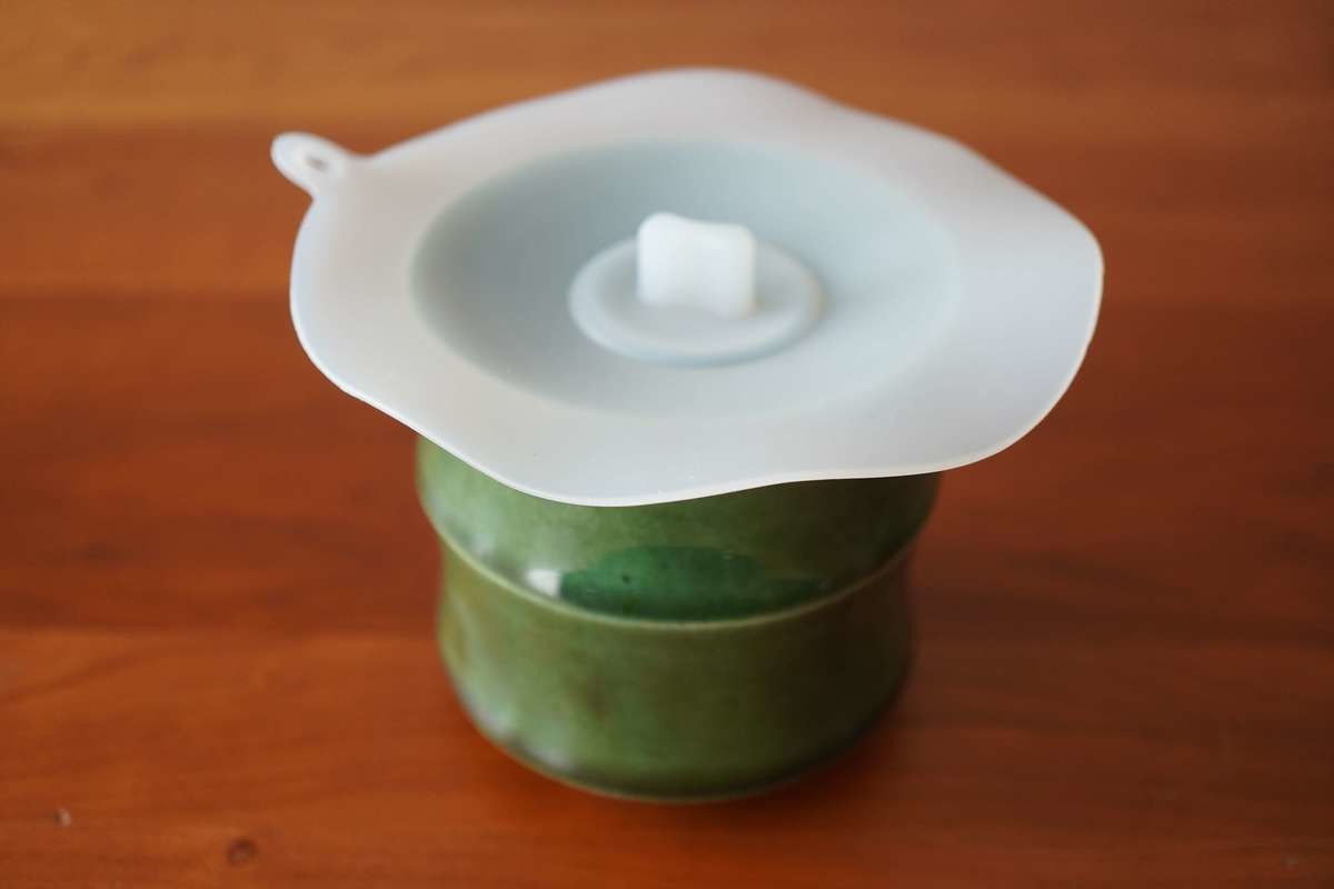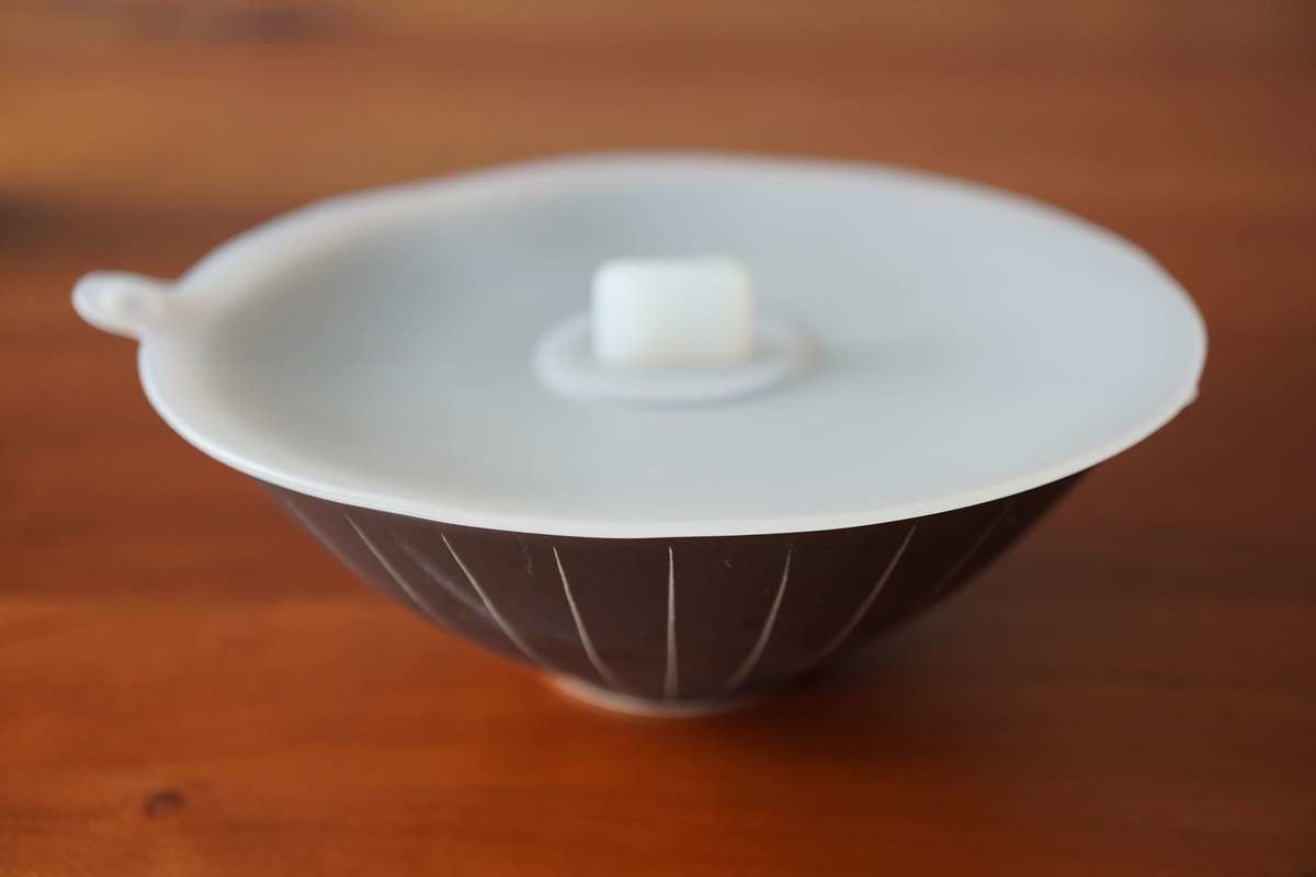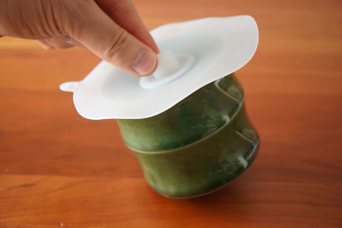 容器にシリコーンラップをのせて真ん中の取っ手を押すと密閉することができます。