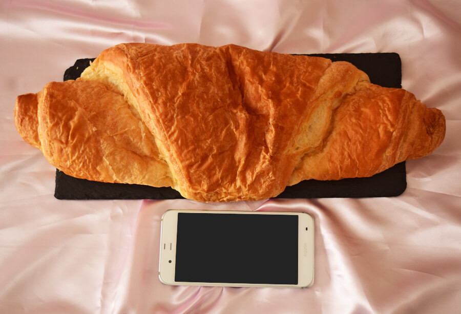 あまりにも大きいので、まずは手持ちのスマホ(149×73×7.6mm)と並べてみました。グロワッサンの圧倒的な大きさ……!