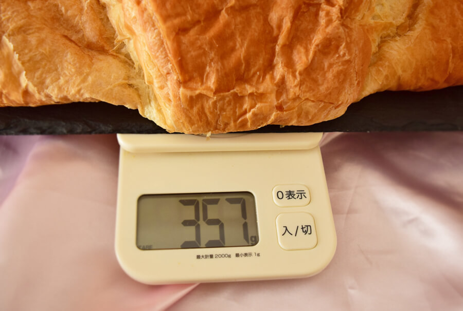 (皿の重さを抜いて)重さを測ると、357gありました。グロワッサンの大きさを考慮すると重くない気がしますが、ちょっとしたお弁当と同じくらいの重さがあります。