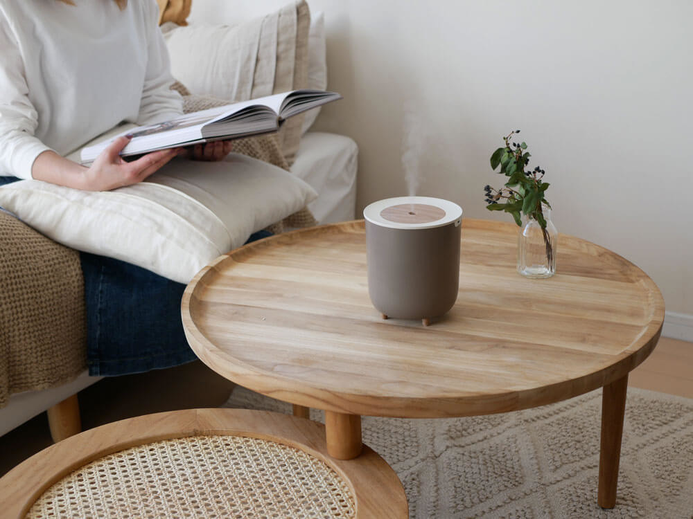 いつでもどこでも手軽に使える、充電式コードレス加湿器「フォグミスト」。コロンとしたフォルムとウッド調の天板がナチュラルモダンに。