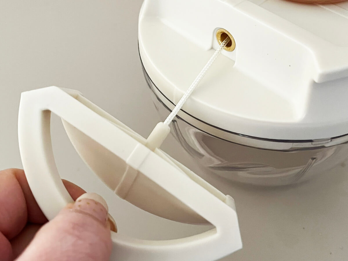 そして実際に使う時には、蓋についている取手部分を思い切り引っ張ります。すると中のカッターが回転し、素材をカットしていくのが「ハンディーチョッパー」の仕組みです。