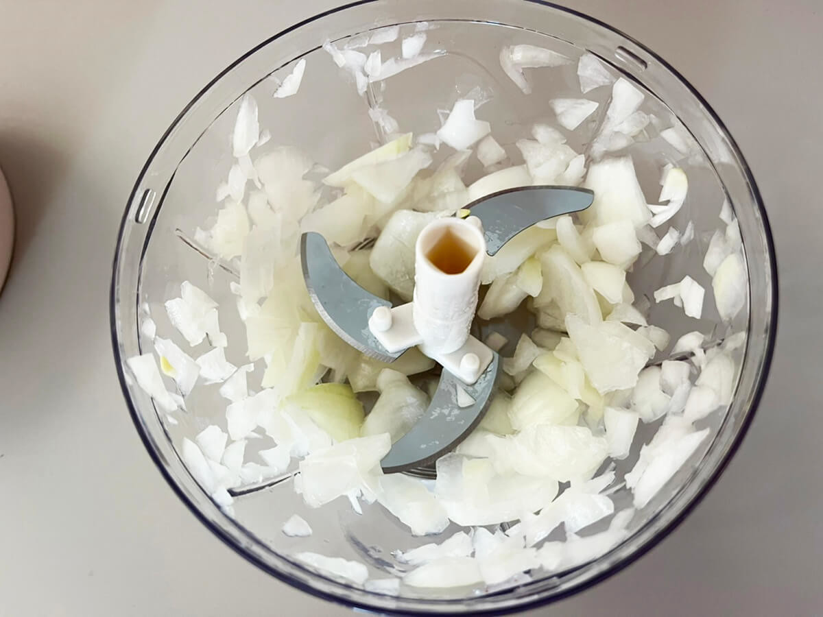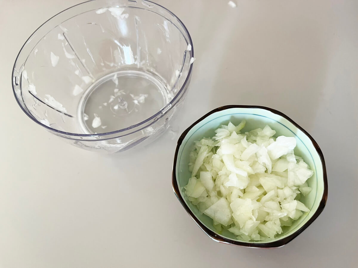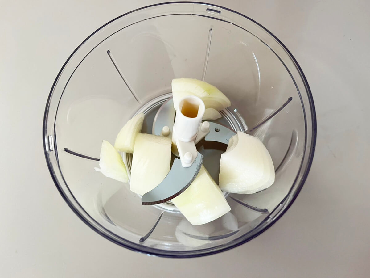 今回は、玉ねぎ半個分のみじん切りを作ってみました。まずは適当な大きさに包丁で切って、すでにカッターをセッティング済みの容器の中に入れます。