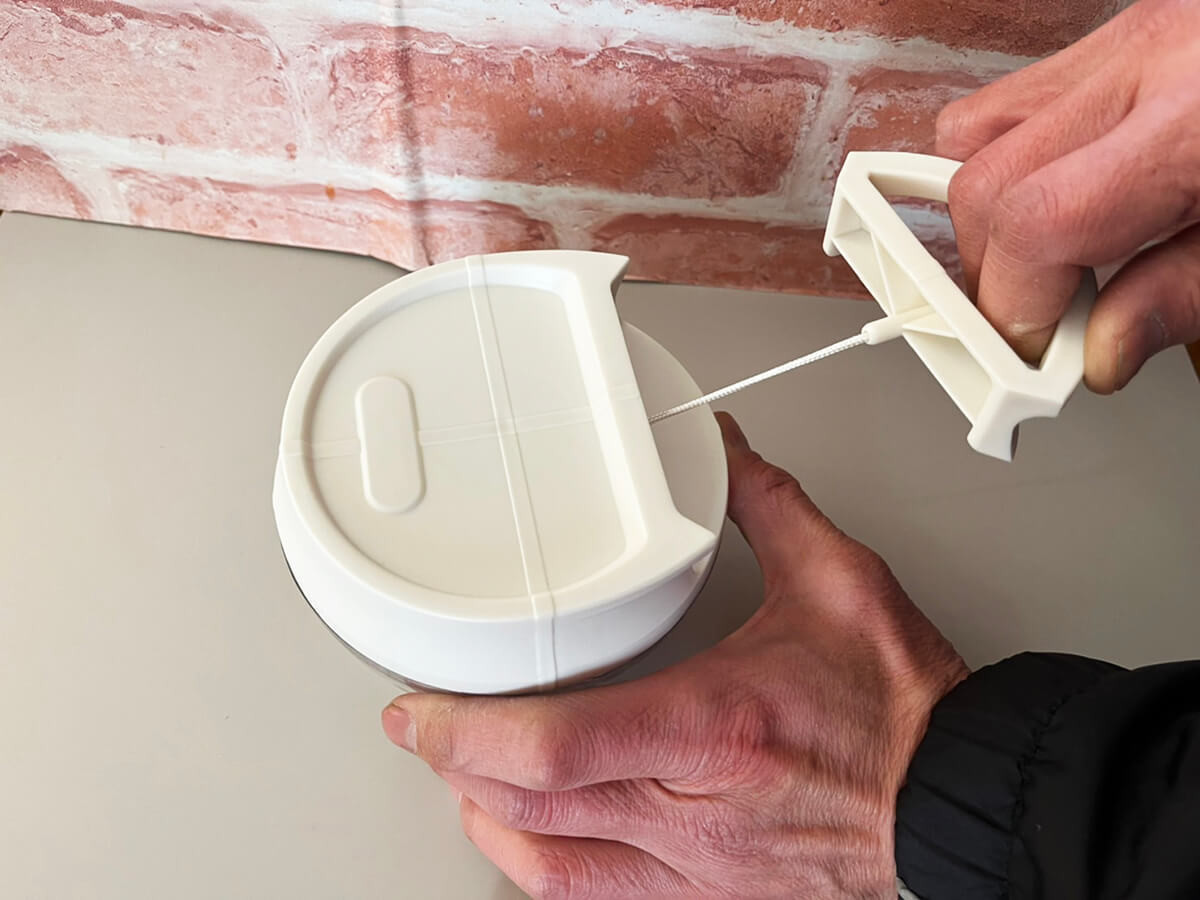 組み立て方もとても簡単で、容器の中にカッターをはめ込むだけです。そこに上から蓋をすると、蓋の裏側の突起物がカッターの上の突起物に空いた穴に刺さる仕組みになっています。