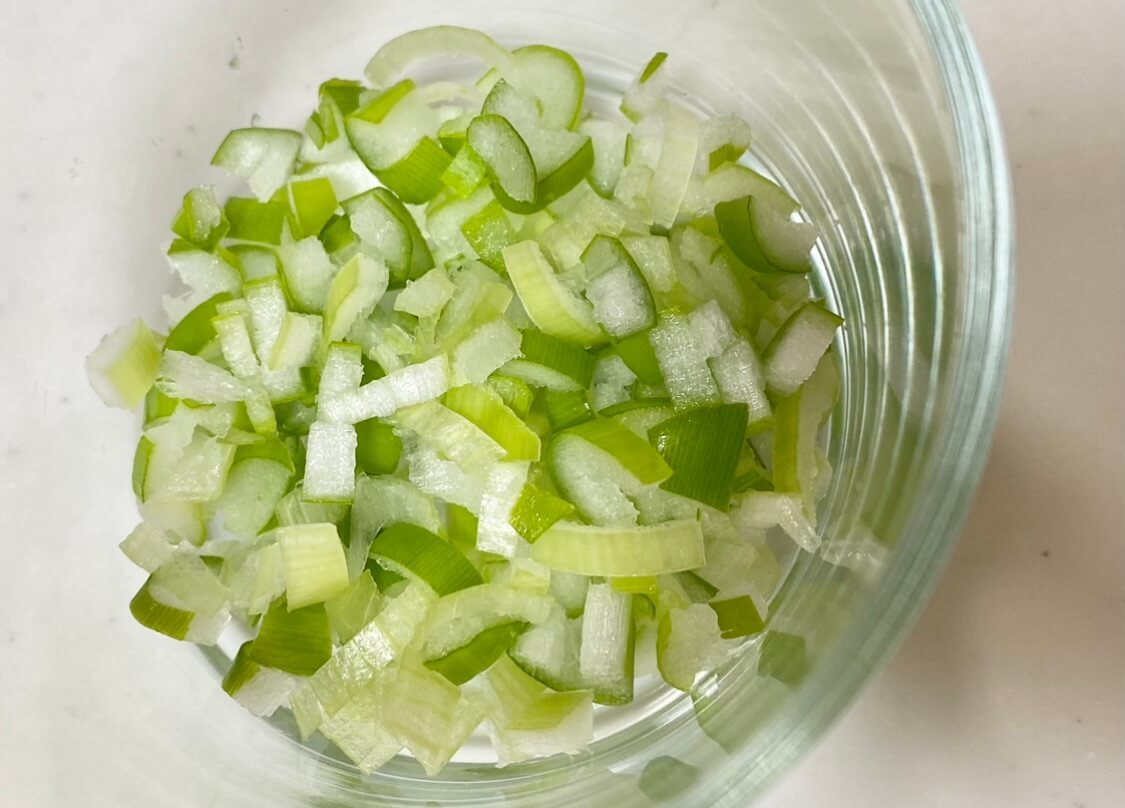 まず、長ネギをみじん切りしていきます。長ネギの食感も楽しみたかったので、今回は荒めに切りました♪