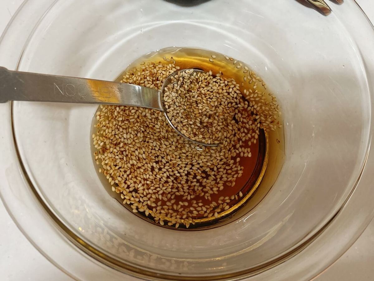 ②ボウルにめんつゆ大さじ2、ごま油大さじ1、いりごま小さじ1を入れよく混ぜる