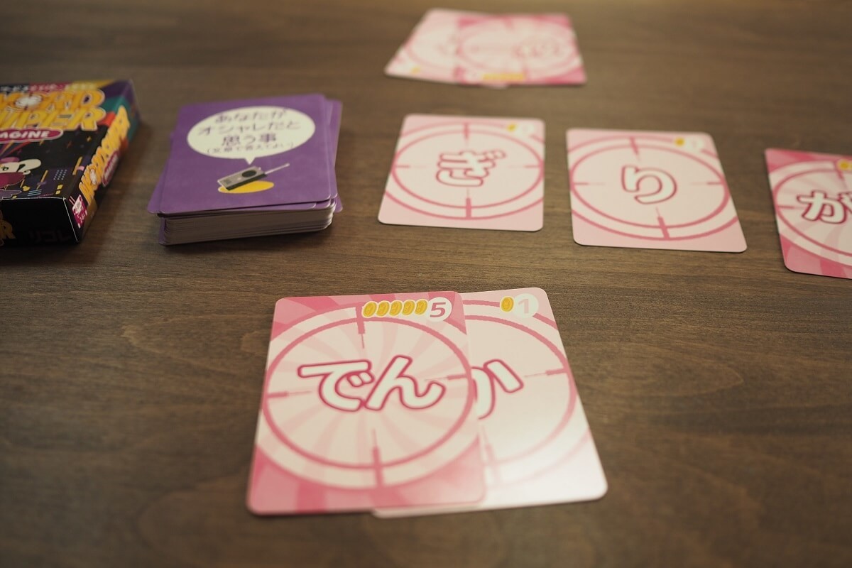山札のてっぺんには「冷たいもの」などのお題が表示されるので、場に置かれた文字が「こ」であれば「こおり」、「そ」であれば「そふとくりーむ」という具合に素早く答えましょう。
