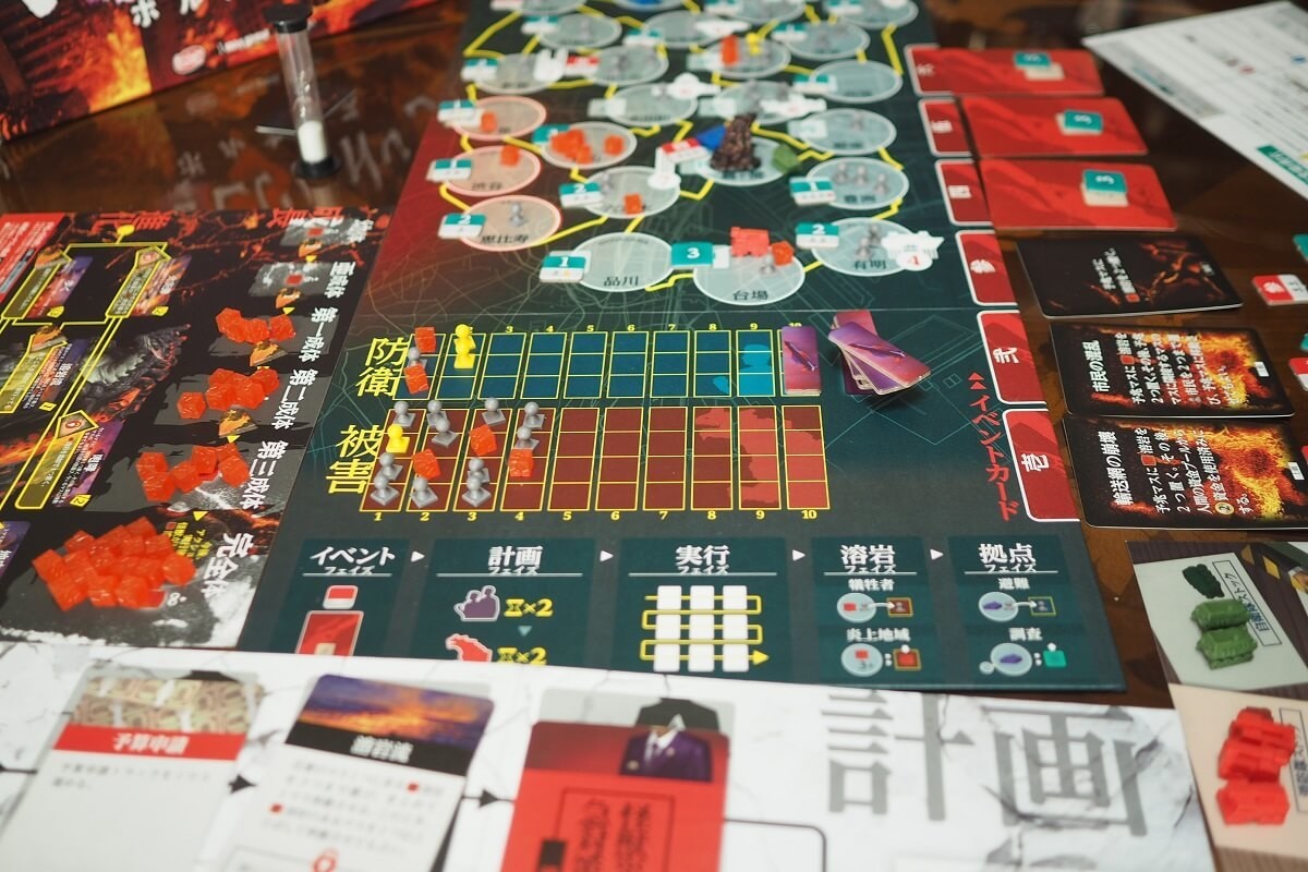 怪獣の進撃や街の被害を食い止めるために毎ラウンド2分間で防衛計画を立てなければならないのですが、すぐそばで怪獣が盗み聞きしているためなかなかうまく防衛できません。