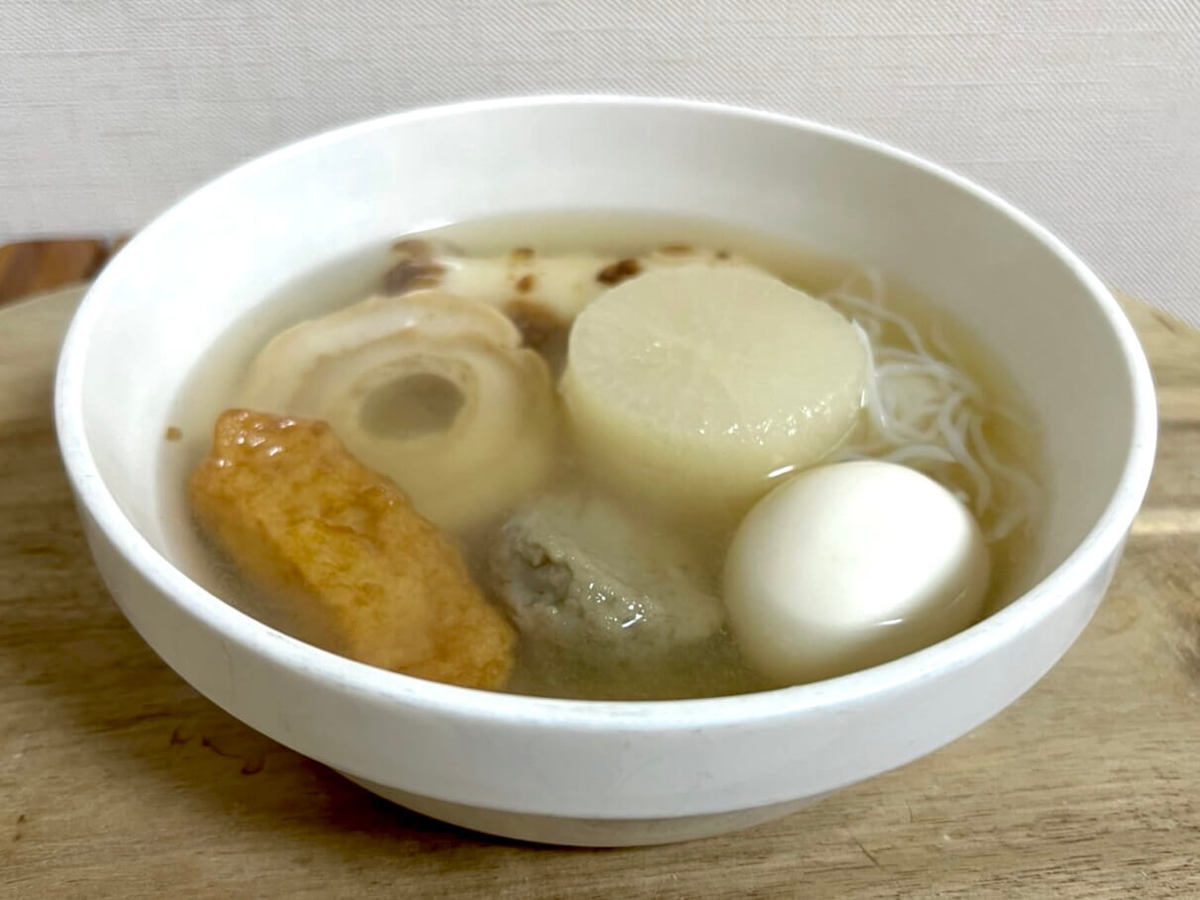 それ以外の6種類の具は、さきほどの牛すじおでんと同じく、大根、卵、しらたき、さつま揚げ、焼きちくわ、車麩です。