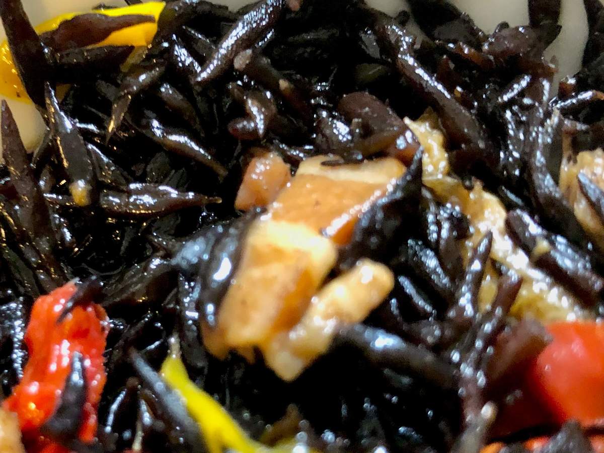 切り干し大根と同じく、お惣菜では定番の「ひじきの煮物」。野崎さんは、ベーコンを入れました。ひじきの煮物にベーコンって入れたことない!