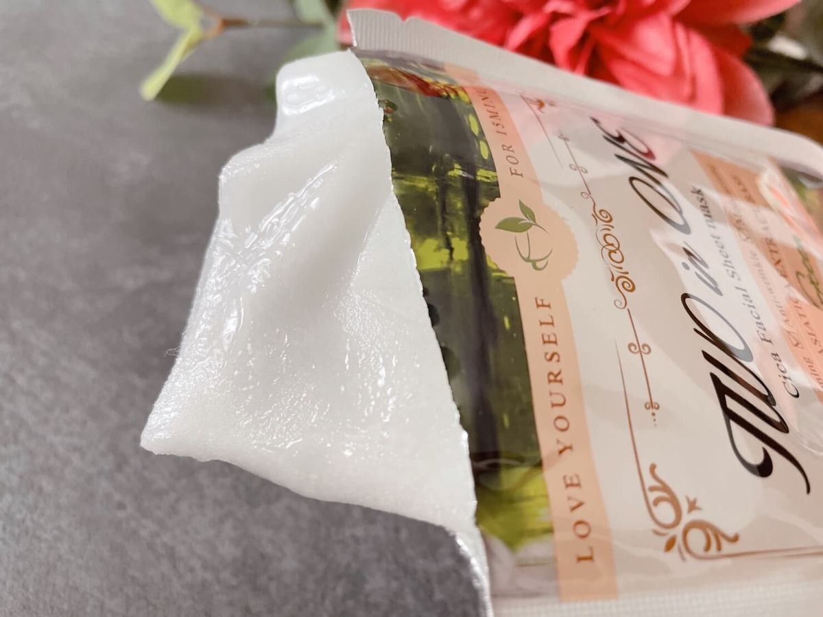 シート自体も厚めでしっかり美容液を吸収しているので、貼っている途中で乾くこともなく、最後まで瑞々しいどころか、美容液が溢れていました。