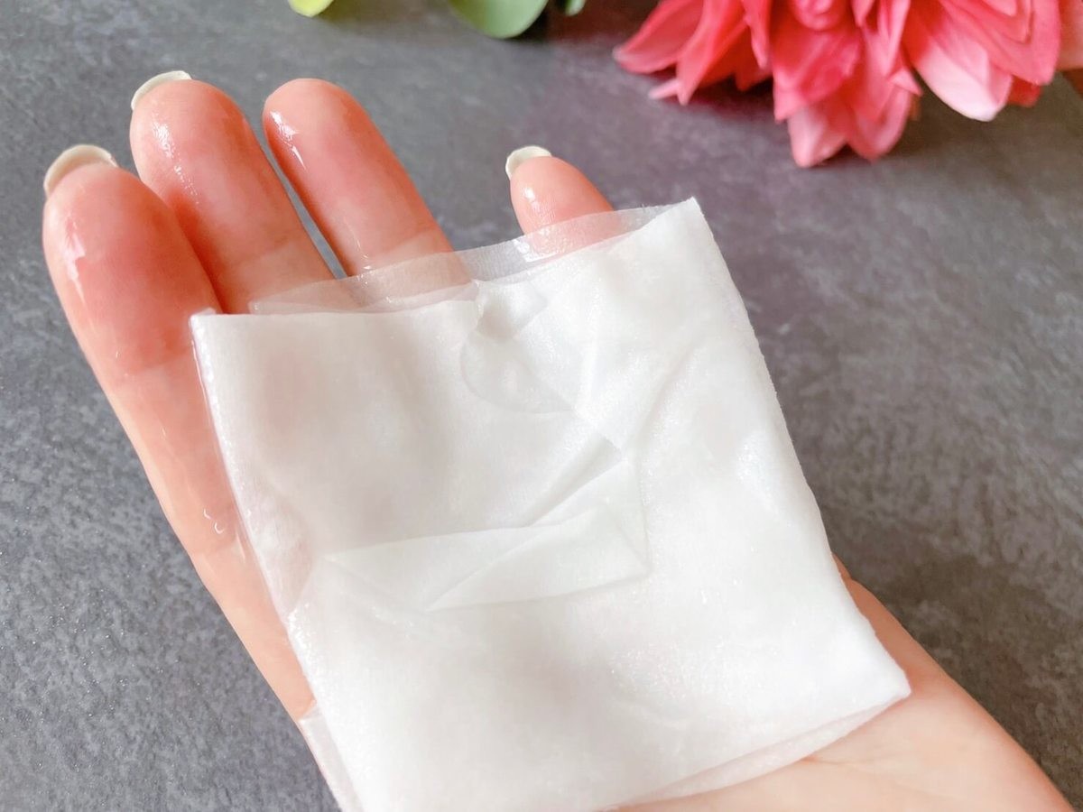 たっぷりの美容液に浸かったシートが出てきます。1シートに美容液が25mlも入ってるので、こうしている間も美容液がシートからポタポタとこぼれ落ちる!